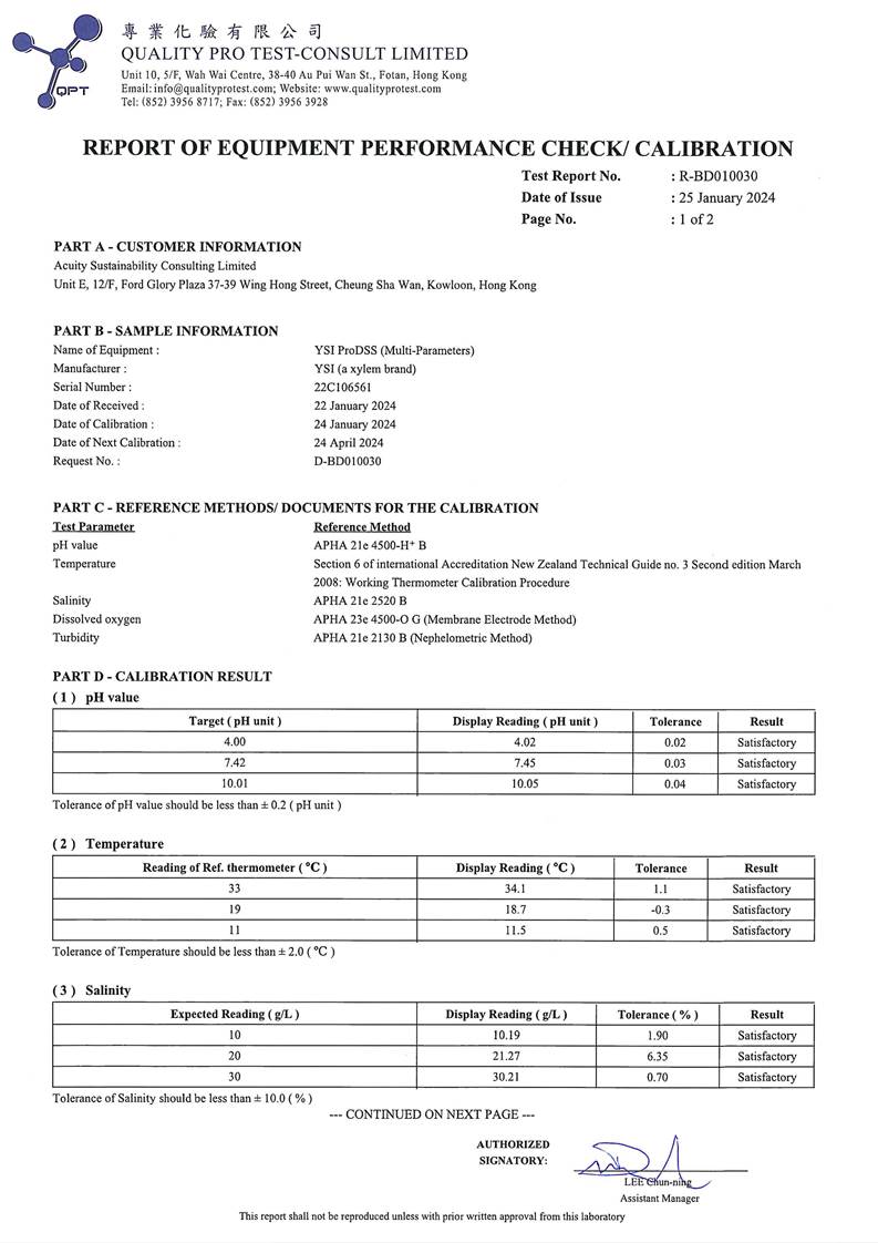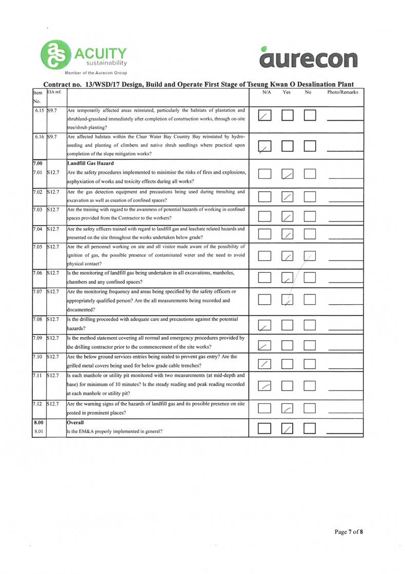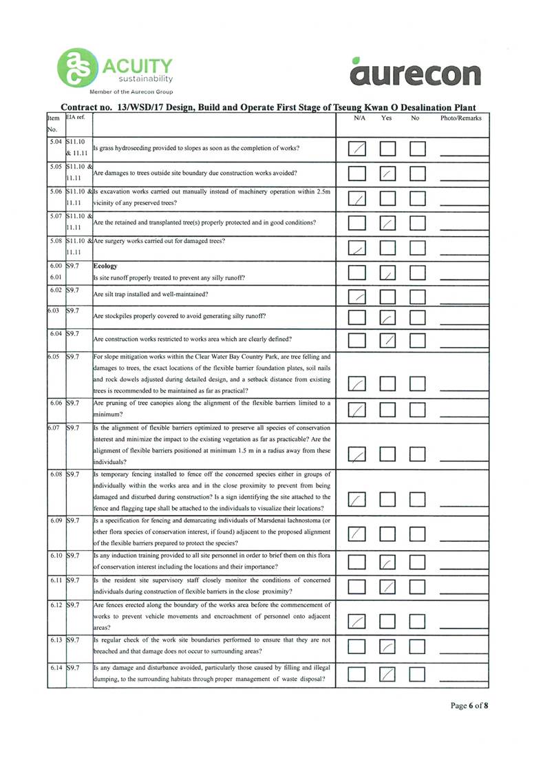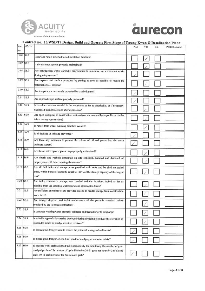 A2. In accordance with the Environmental Monitoring and Audit (EM&A) Manual for the Contract, EM&A works for marine water quality, noise, waste management and ecology should be carried out by Environmental Team (ET), Acuity Sustainability Consulting Limited (ASCL), during the construction phase of the Contract.