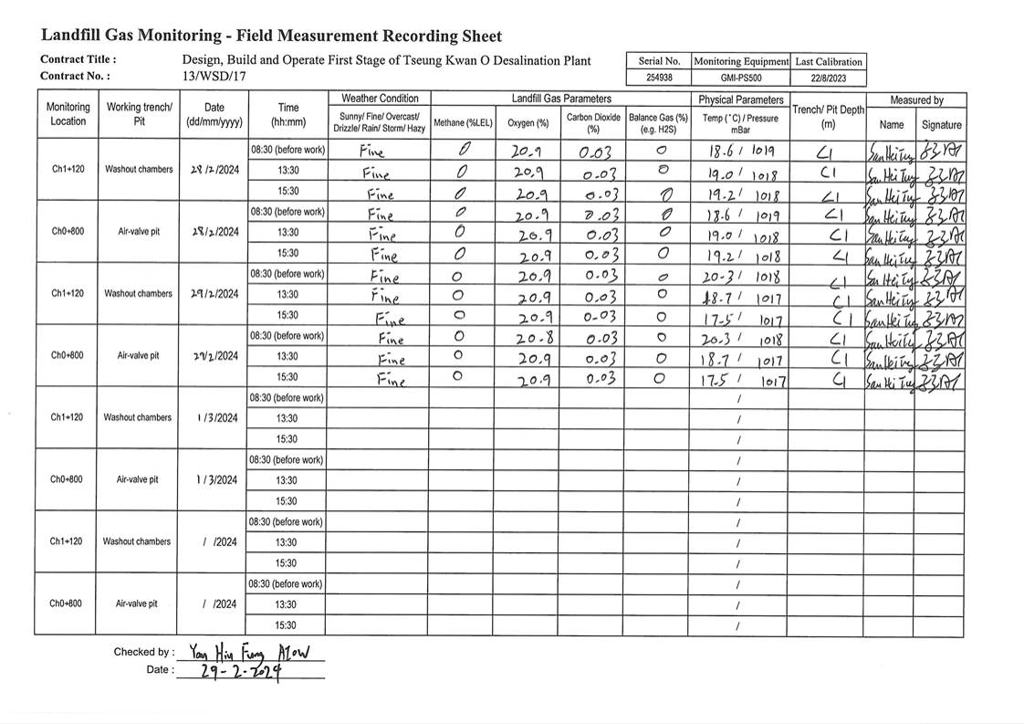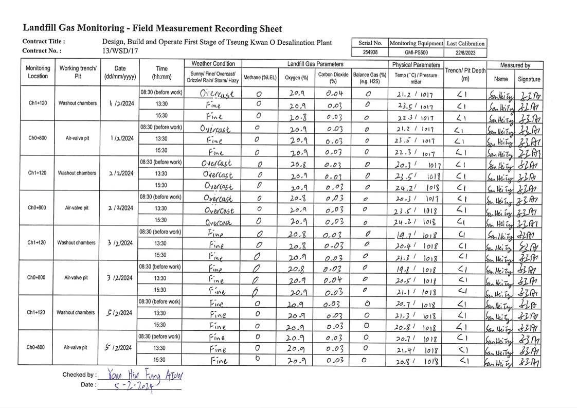 A14. In this reporting period, 126 times of landfill gas monitoring were periodically conducted at TKO Area 137 (Ch1+340 - Ch1+600). No exceedances of action level and limit level was observed.