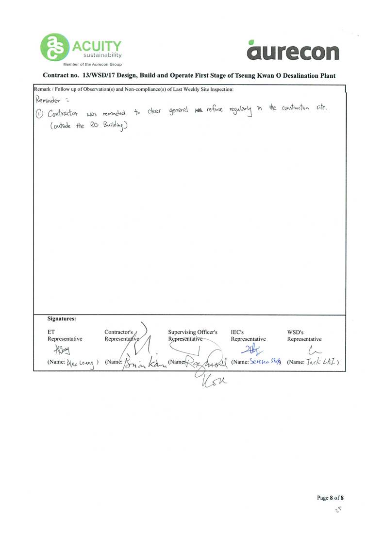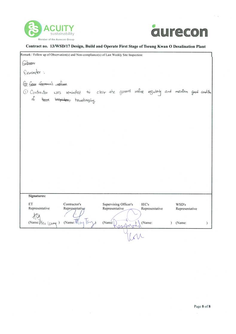 A15. Joint site inspections of the construction work by ET and IEC were carried out on 16 and 28 February 2024 to audit the mitigation measures implementation status. Reminders were recorded in the site inspection checklists and provided to the contractors together with the appropriate follow-up actions where necessary.