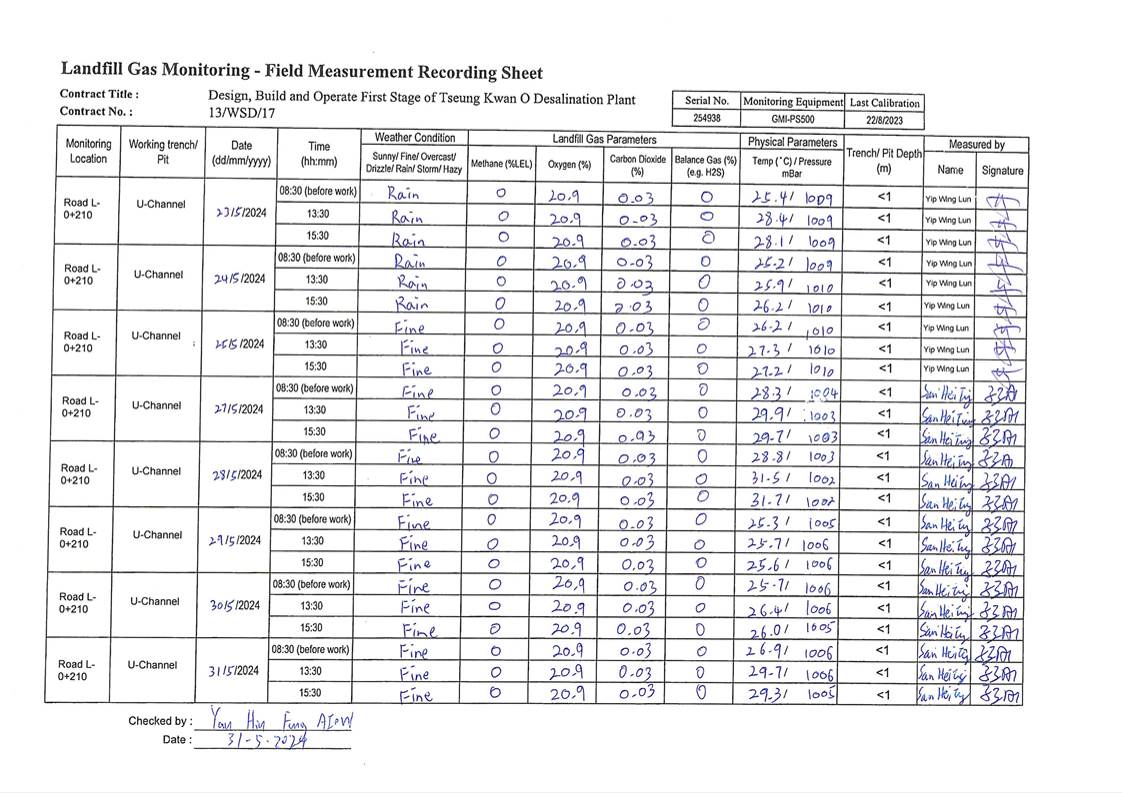 A14. In this reporting period, 96 times of landfill gas monitoring were periodically conducted at TKO Area 137 (Ch1+120 - Ch1+800). No exceedances of action level and limit level was observed.