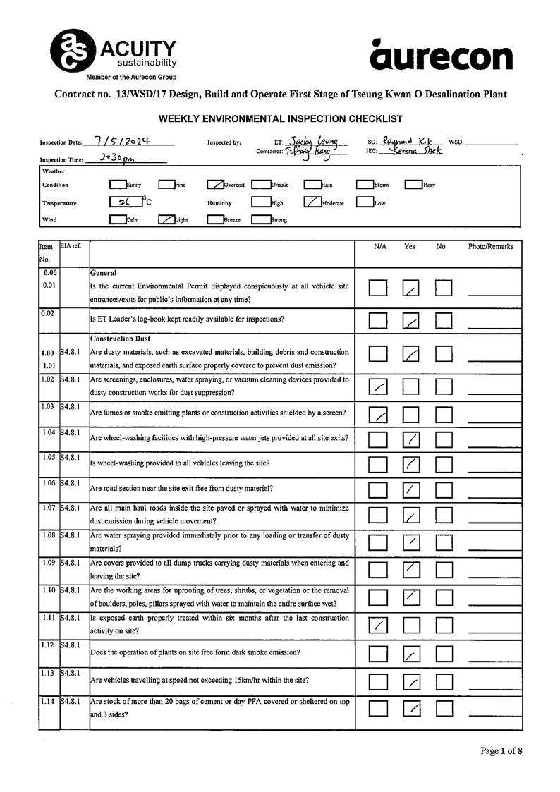 A15. Joint site inspections of the construction work by ET and IEC were carried out on 28 May 2024 to audit the mitigation measures implementation status. Reminders were recorded in the site inspection checklists and provided to the contractors together with the appropriate follow-up actions where necessary.