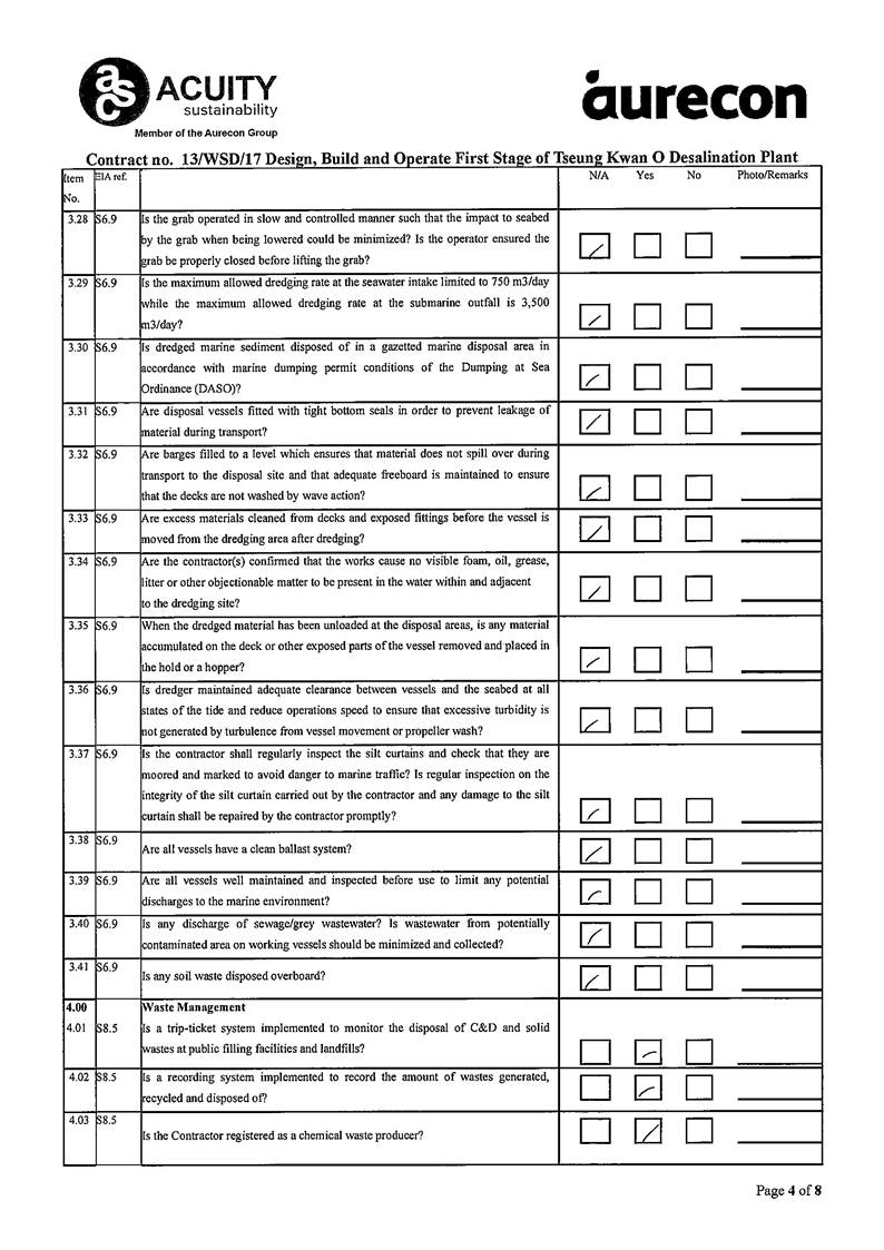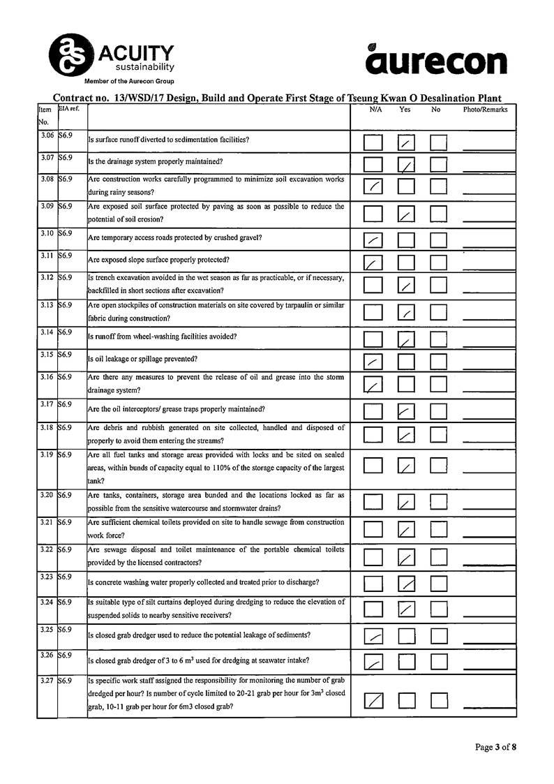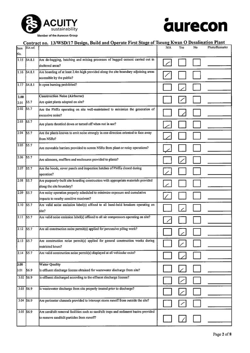 A2. In accordance with the Environmental Monitoring and Audit (EM&A) Manual for the Contract, EM&A works for marine water quality, noise, waste management and ecology should be carried out by Environmental Team (ET), Acuity Sustainability Consulting Limited (ASCL), during the construction phase of the Contract.