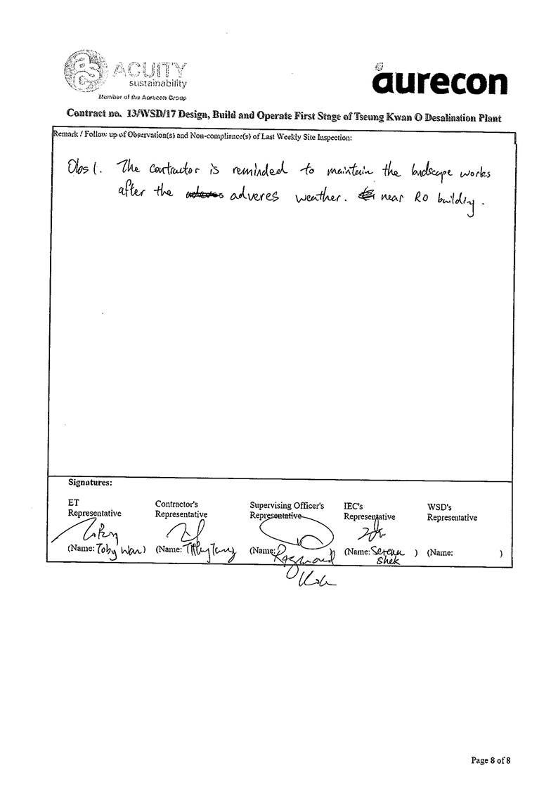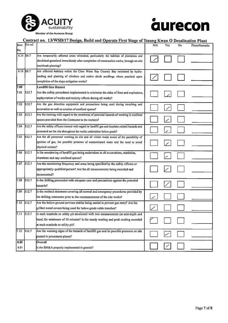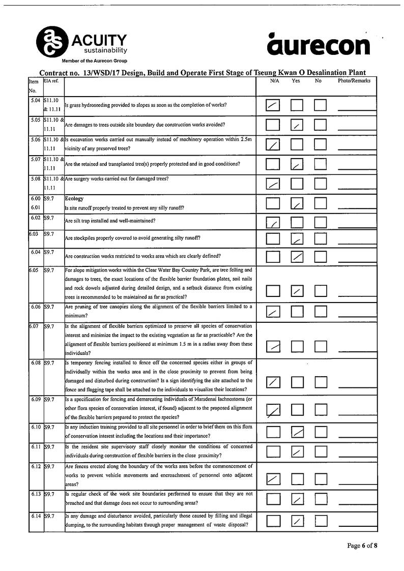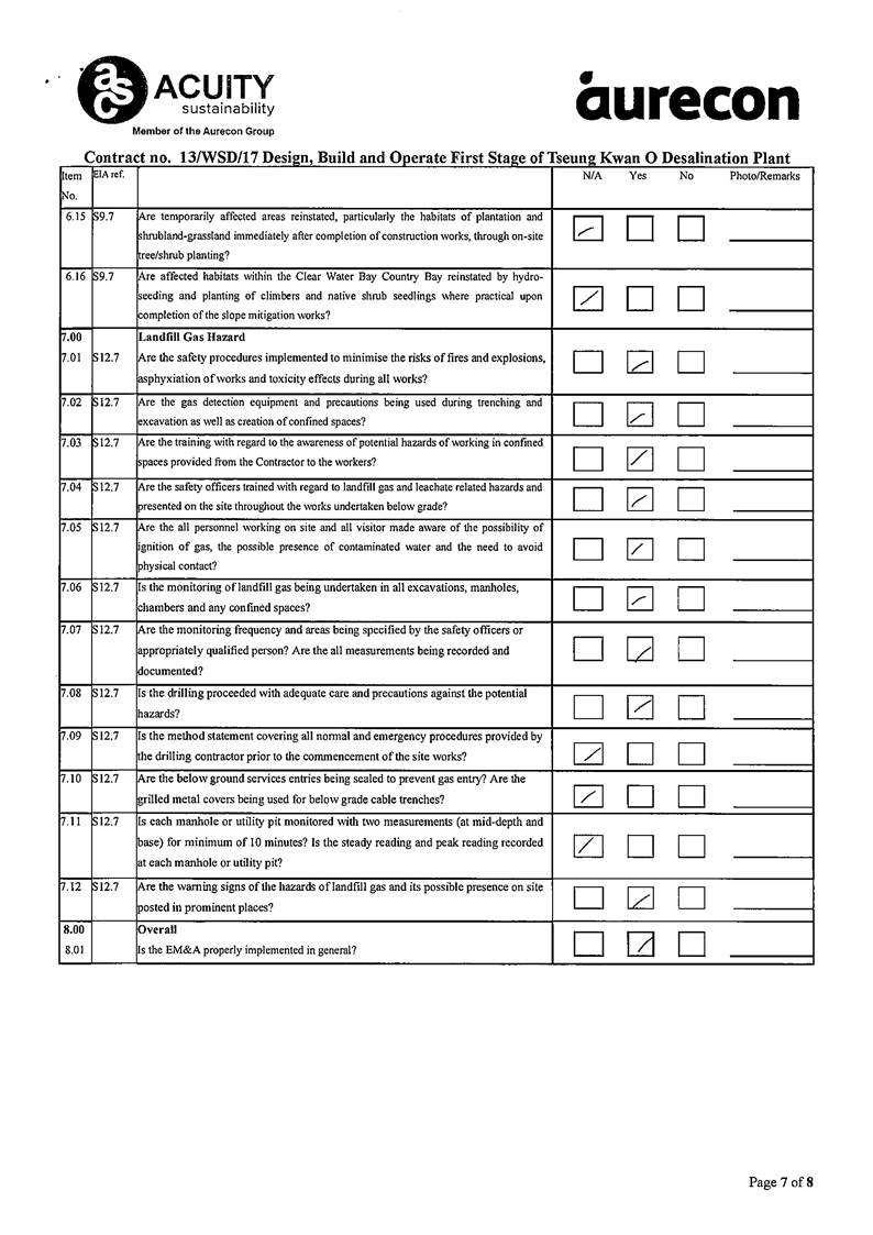 A2. In accordance with the Environmental Monitoring and Audit (EM&A) Manual for the Contract, EM&A works for marine water quality, noise, waste management and ecology should be carried out by Environmental Team (ET), Acuity Sustainability Consulting Limited (ASCL), during the construction phase of the Contract.
