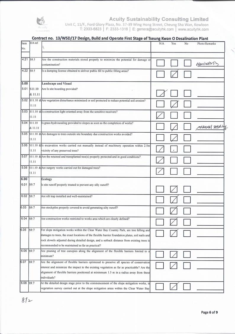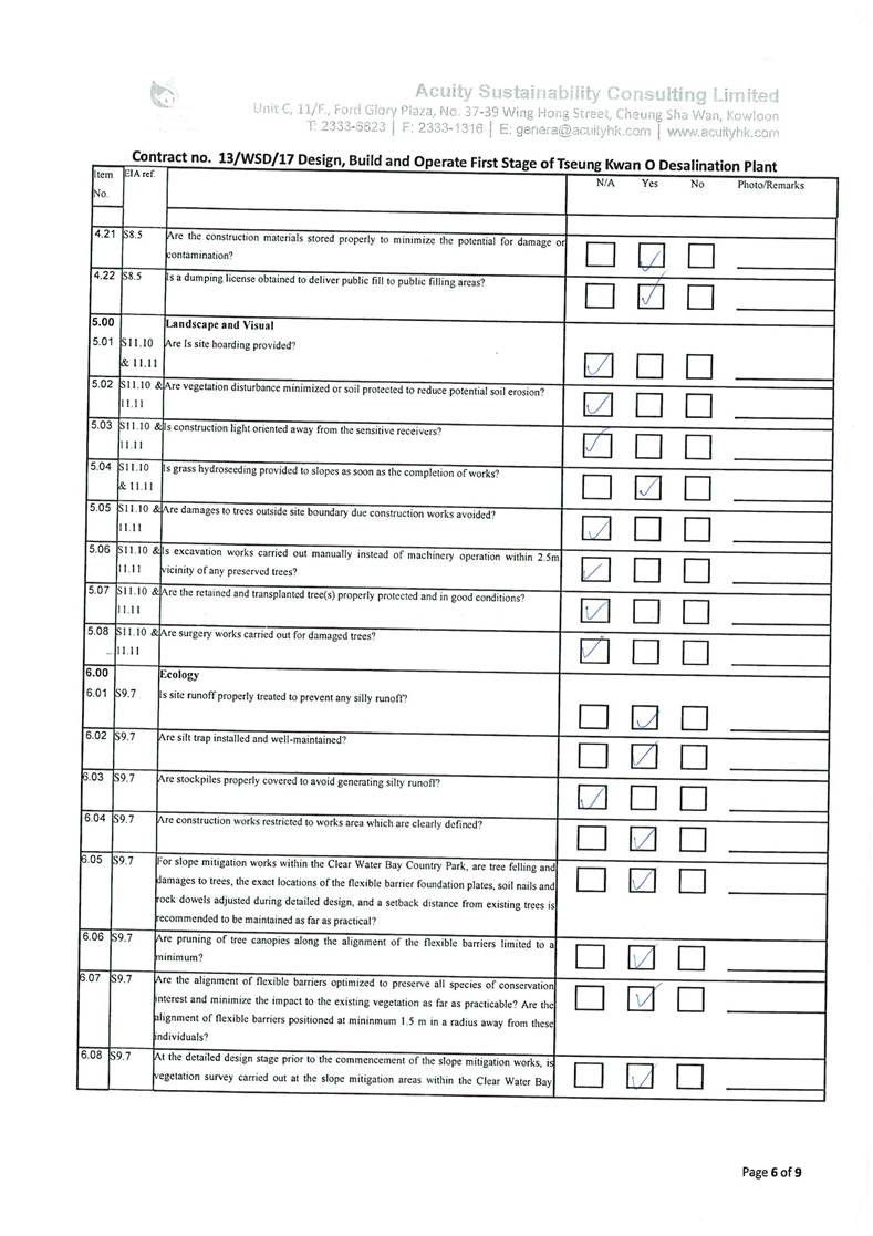 A2. In accordance with the Environmental Monitoring and Audit (EM&A) Manual for the Contract, EM&A works for marine water quality, noise, waste management and ecology should be carried out by Environmental Team (ET), Acuity Sustainability Consulting Limited (ASCL), during the construction phase of the Contract.