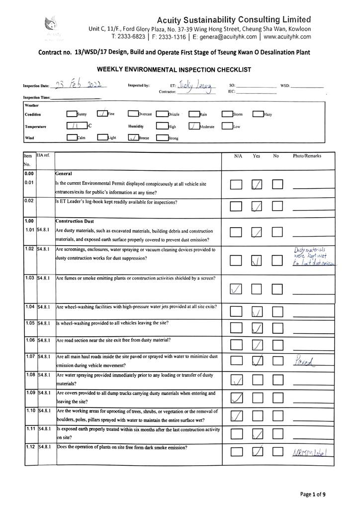 A15. Joint site inspections of the construction work by ET and IEC were carried out on 8, 17, 23 and 28 February 2022 to audit the mitigation measures implementation status. Observations were recorded in the site inspection checklists and provided to the contractors together with the appropriate follow-up actions where necessary.
