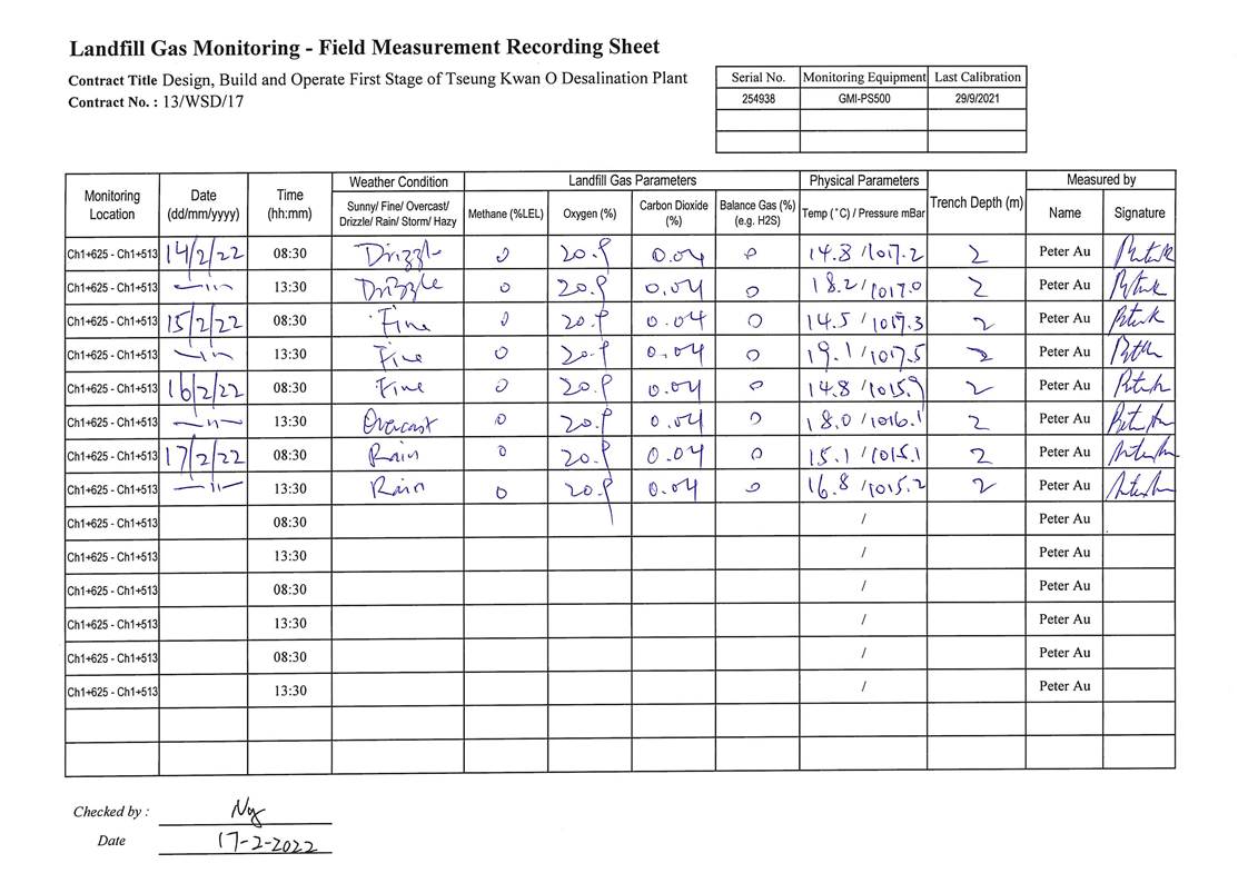 A14. In this reporting period, 18 times of landfill gas monitoring were recorded at Wan Po Road (Ch1+625 - Ch1+513). No exceedance of action and limit levels for methane, oxygen and carbon dioxide was observed. Monitoring was conducted during excavations at 1m depth or more within the consultation zone and whenever workers entered the excavation on the day.