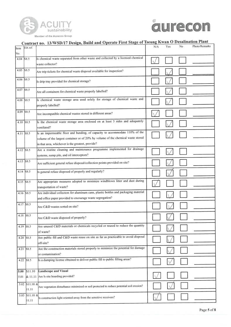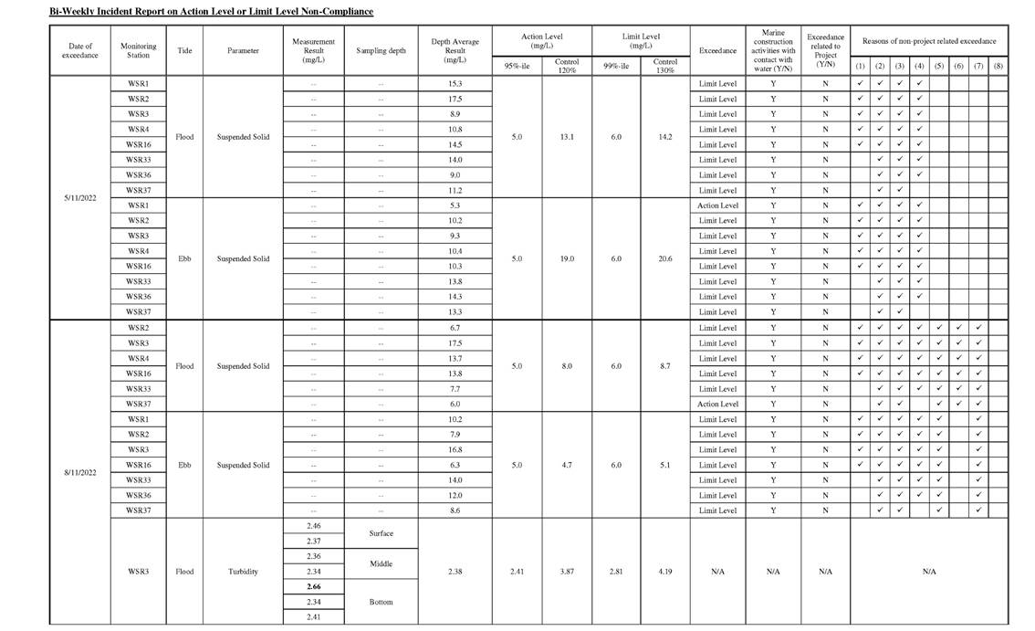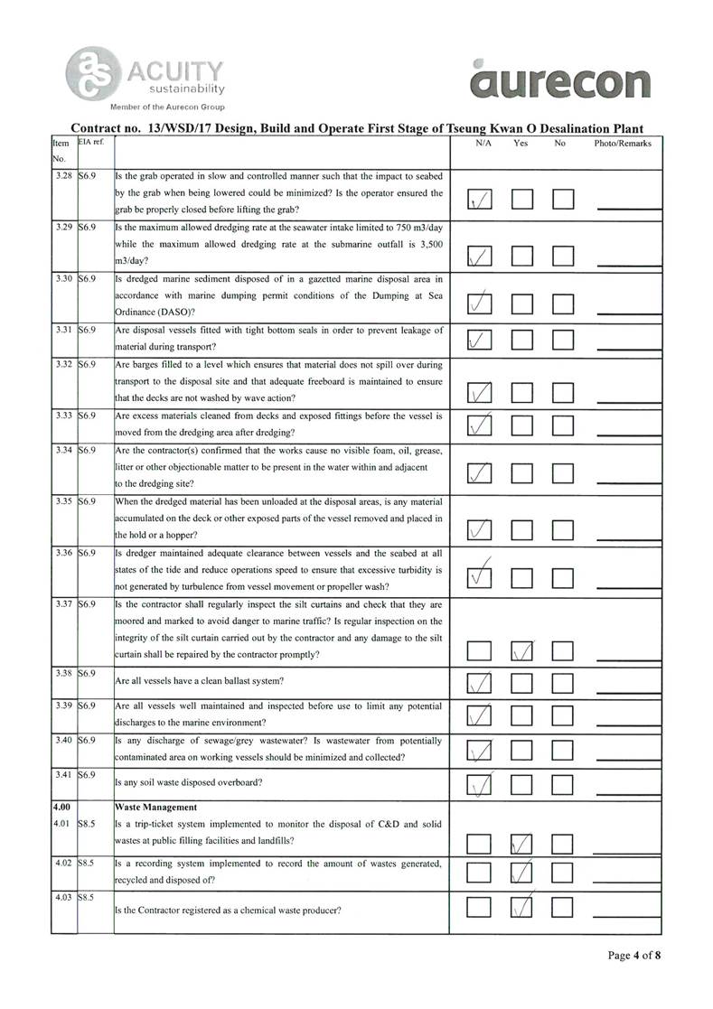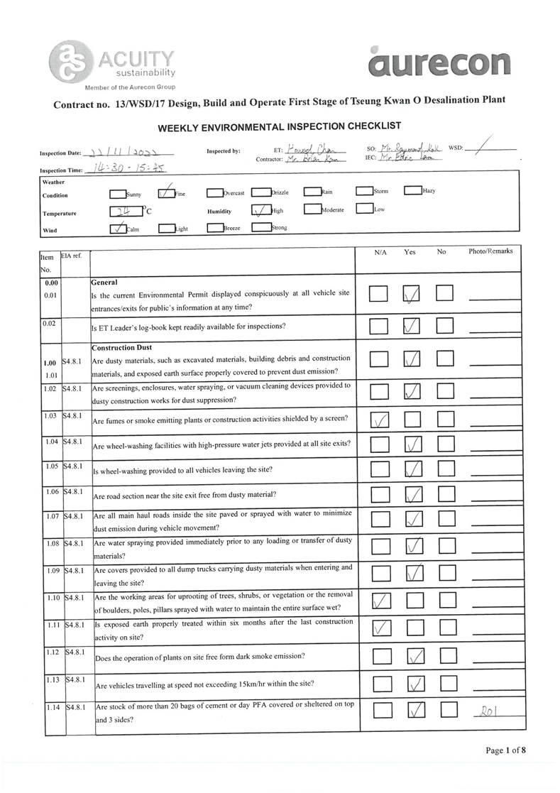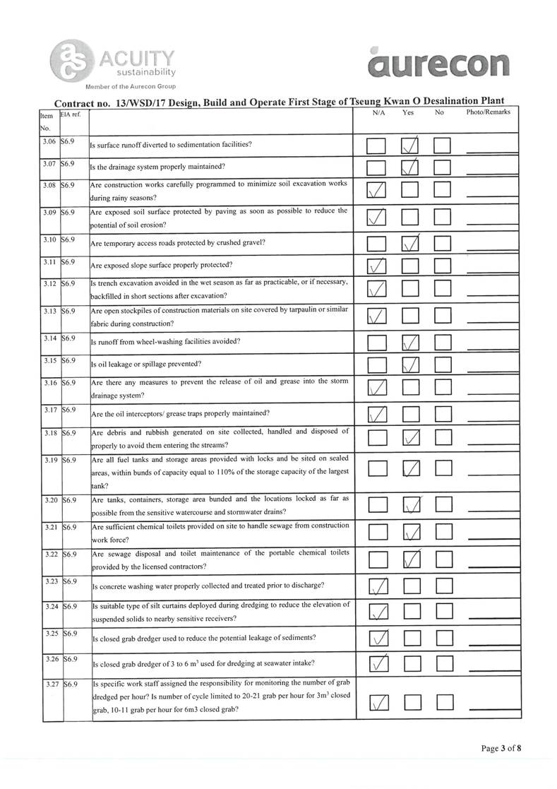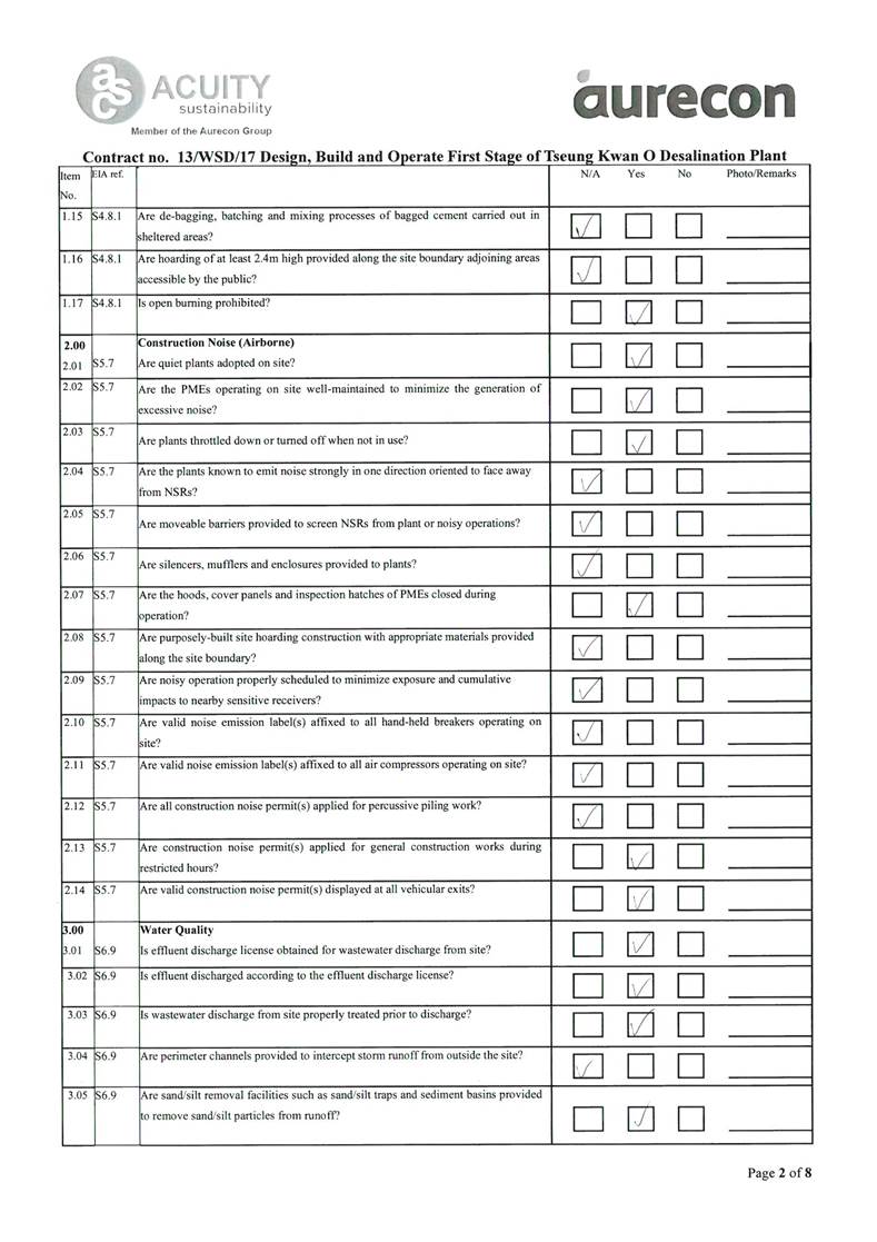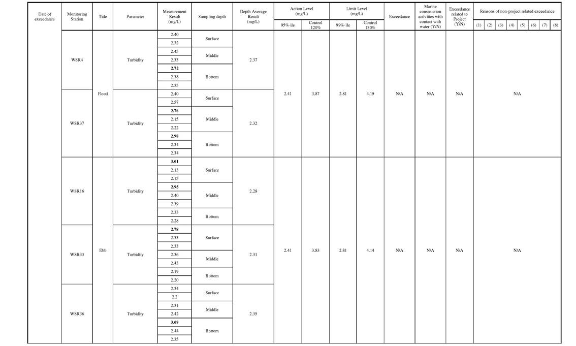A2. In accordance with the Environmental Monitoring and Audit (EM&A) Manual for the Contract, EM&A works for marine water quality, noise, waste management and ecology should be carried out by Environmental Team (ET), Acuity Sustainability Consulting Limited (ASCL), during the construction phase of the Contract.