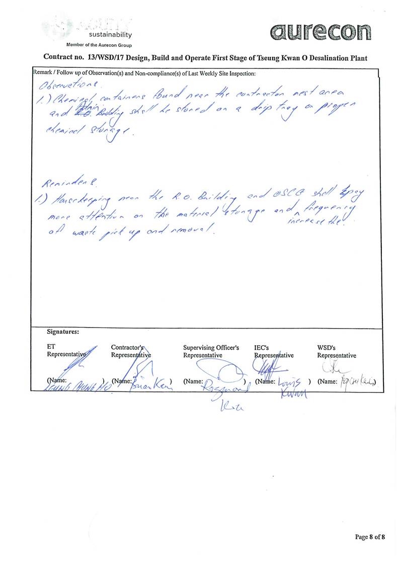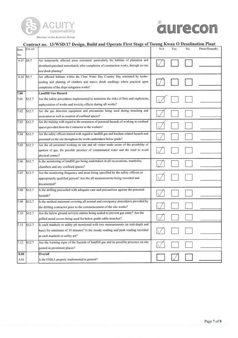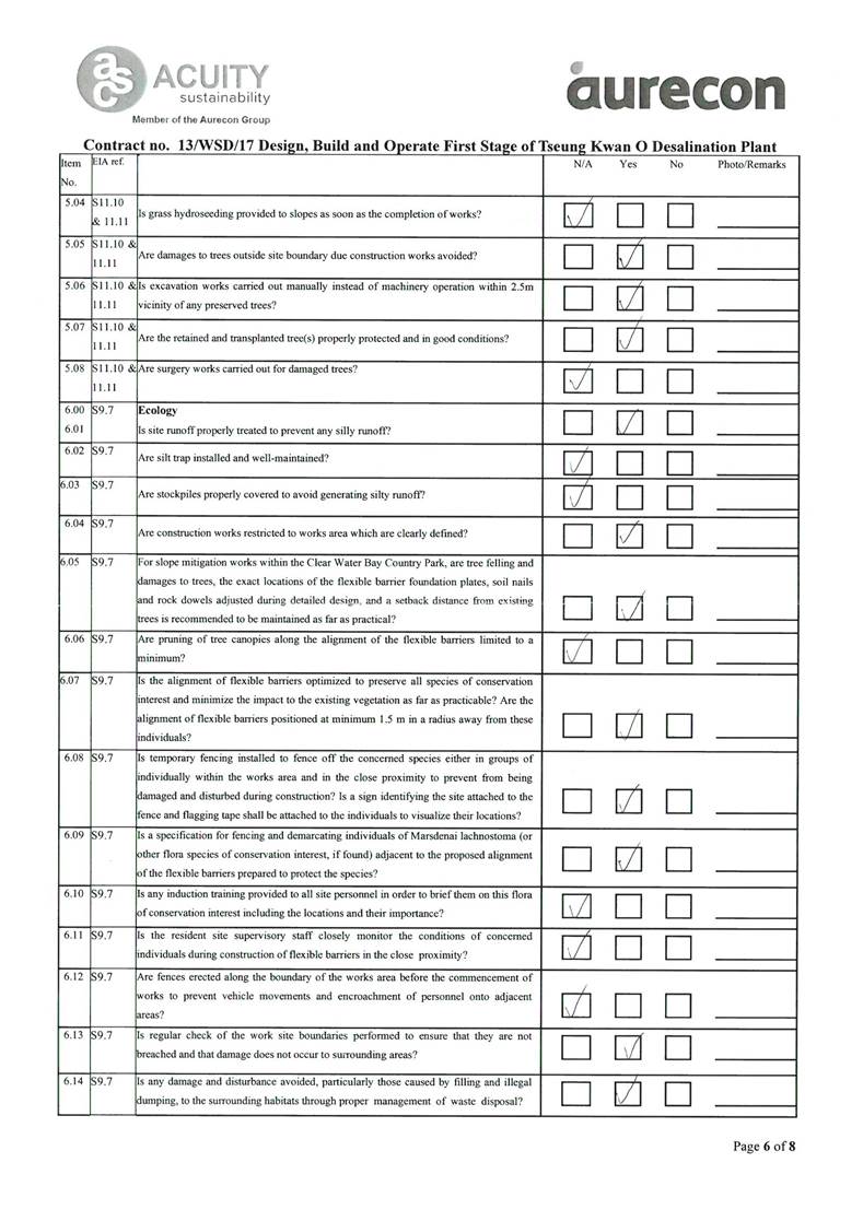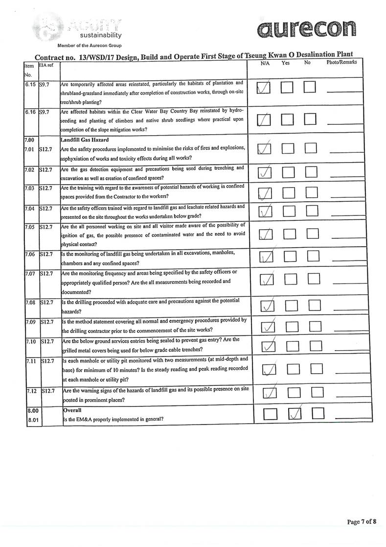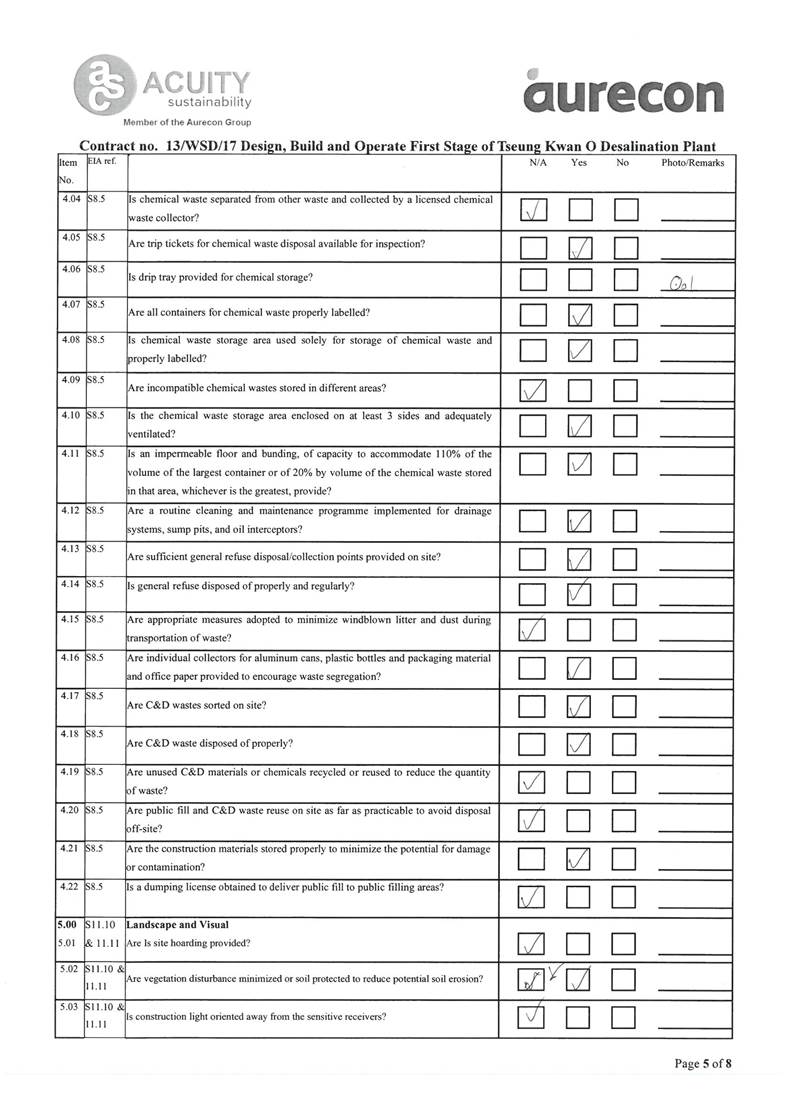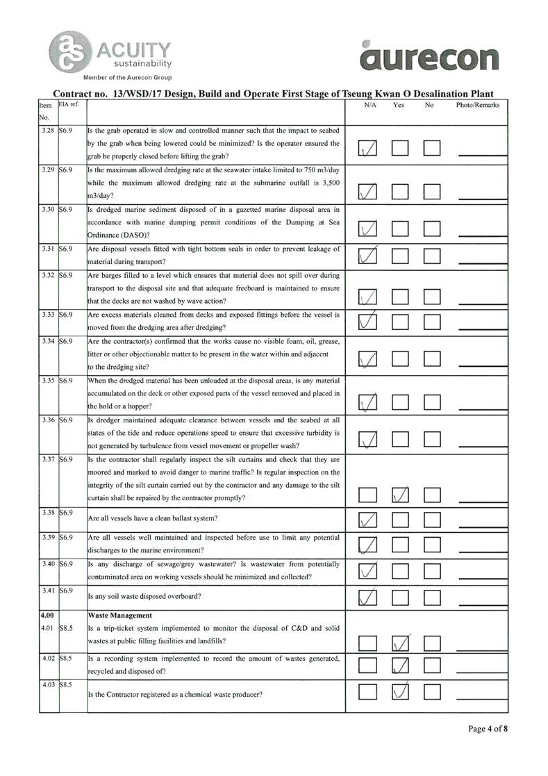 A2. In accordance with the Environmental Monitoring and Audit (EM&A) Manual for the Contract, EM&A works for marine water quality, noise, waste management and ecology should be carried out by Environmental Team (ET), Acuity Sustainability Consulting Limited (ASCL), during the construction phase of the Contract.