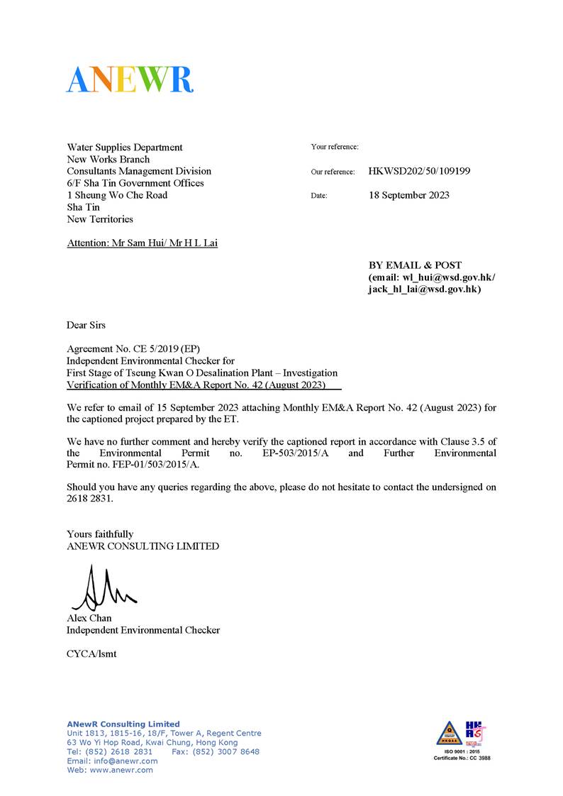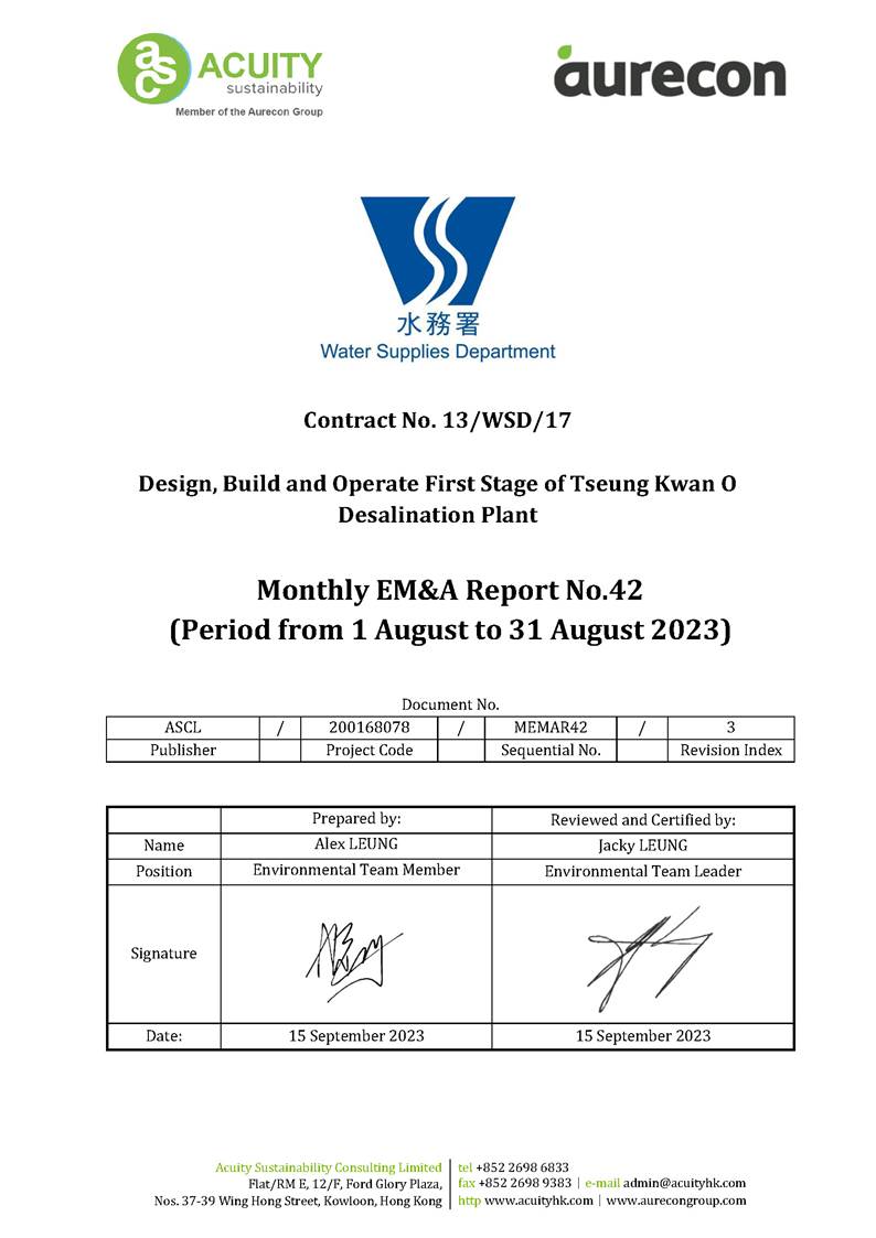 A3. This is the 42nd Monthly EM&A Report, prepared by ASCL, for the Contract summarizing the monitoring results and audit findings of the EM&A programme at and around Tseung Kwan O Area 137 (TKO 137) during the reporting period from 1 August to 31 August 2023.