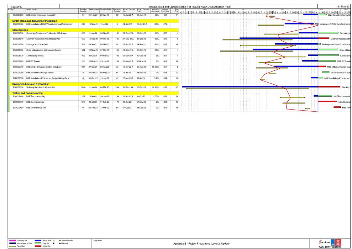 CO2 Tanks - Installation of pipes and electrical wiring Combined Shaft and Pump room - Internal finishing, door, window and louver Other - Watermain works at CLP 132 kV Substation - Structure Construction and steel fence election of Wave Deflector Wall at seawall area - Staircases construction at elevated walkway - Steel Bridge assembly and installation - Rock anchor installation of slop work - Marine works completed |
