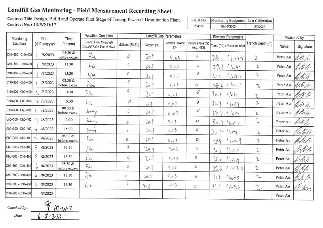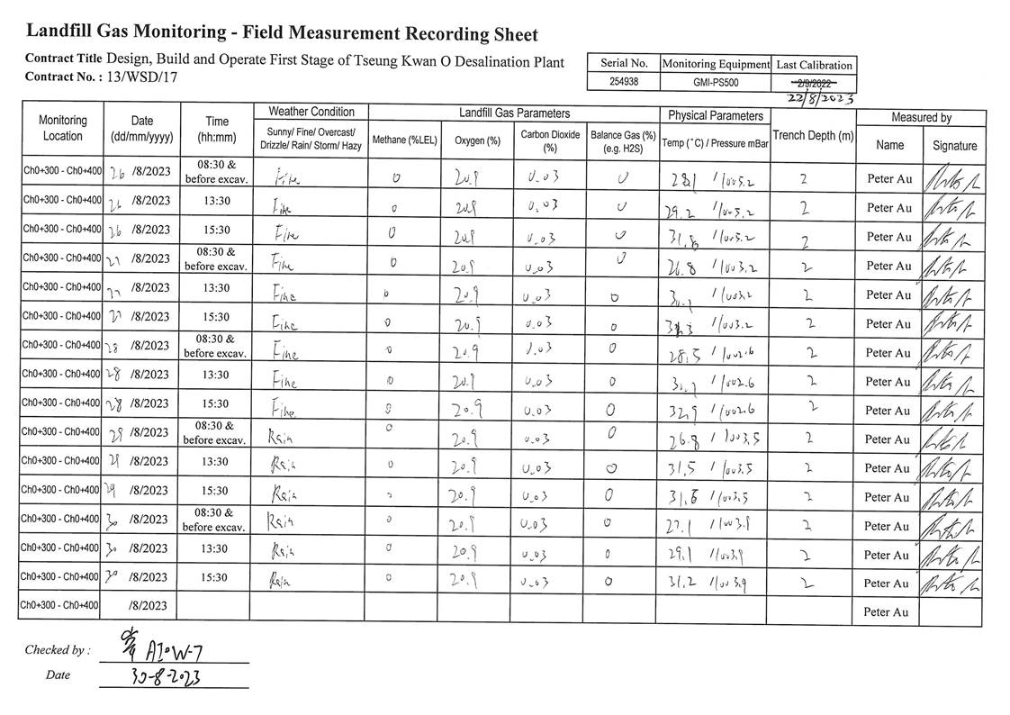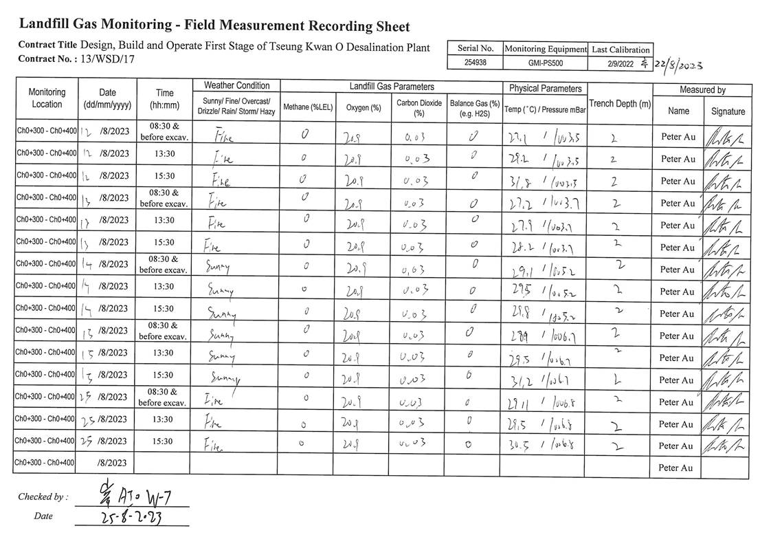 A12. In this reporting period, 60 times of landfill gas monitoring were conducted at TKO Area 137 (Ch1+340 - Ch1+600). No action or limit level exceedance was recorded during the reporting period.