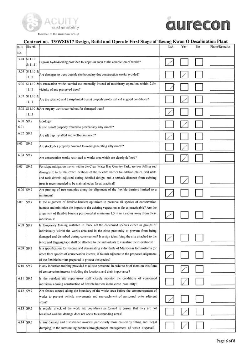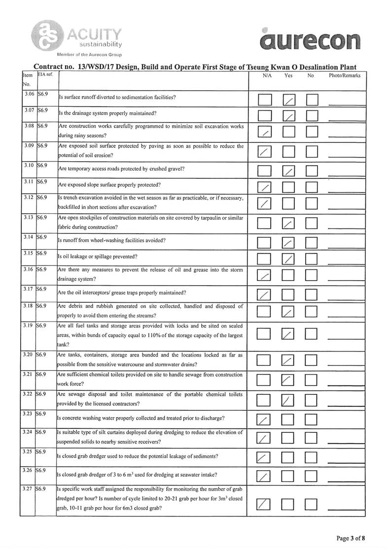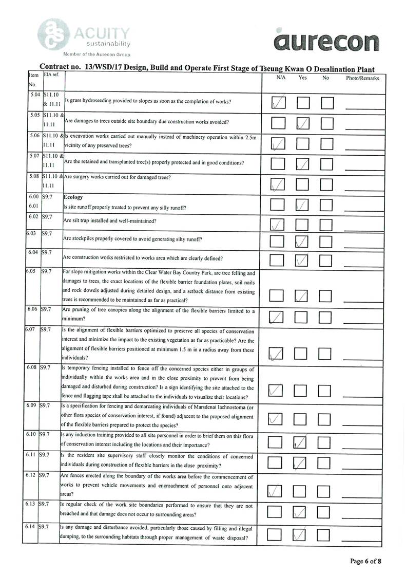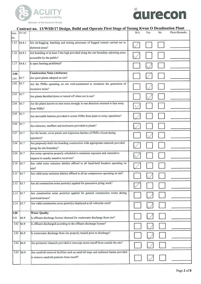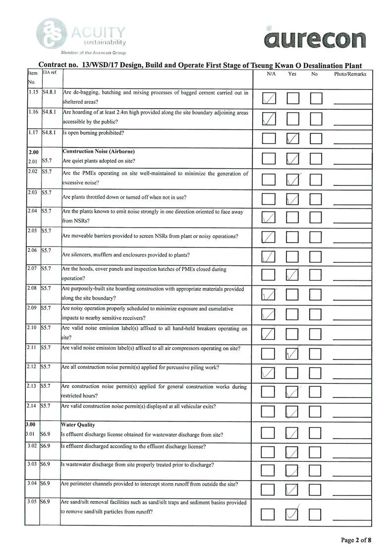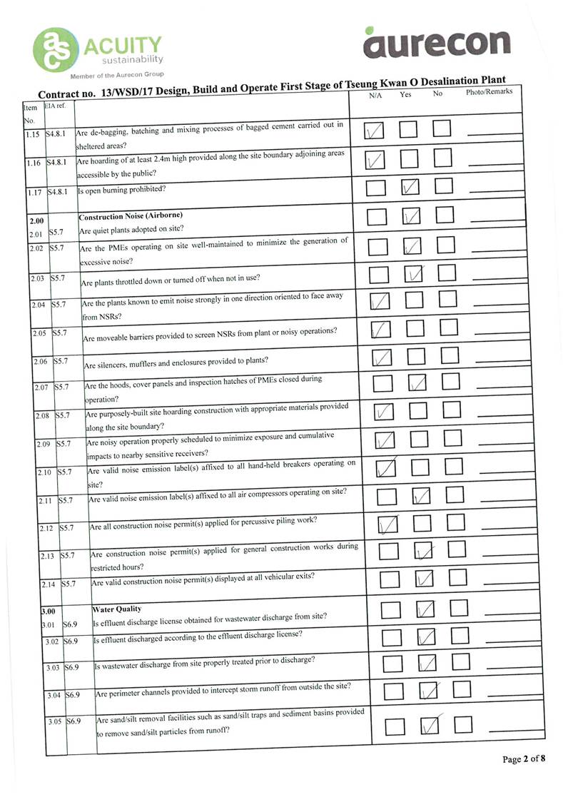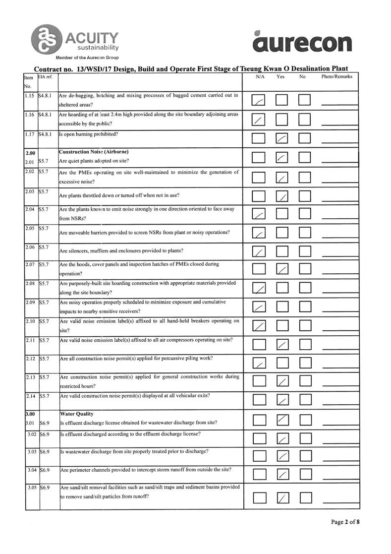 A2. In accordance with the Environmental Monitoring and Audit (EM&A) Manual for the Contract, EM&A works for marine water quality, noise, waste management and ecology should be carried out by Environmental Team (ET), Acuity Sustainability Consulting Limited (ASCL), during the construction phase of the Contract.