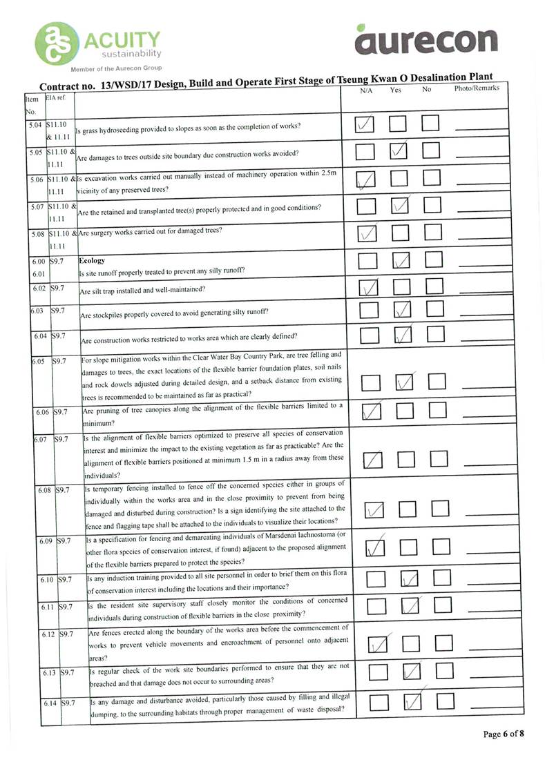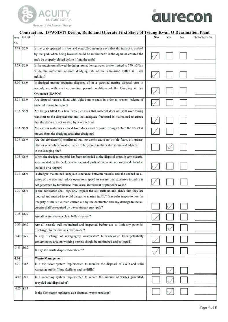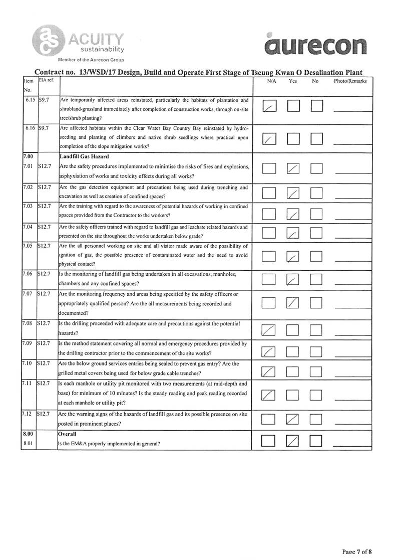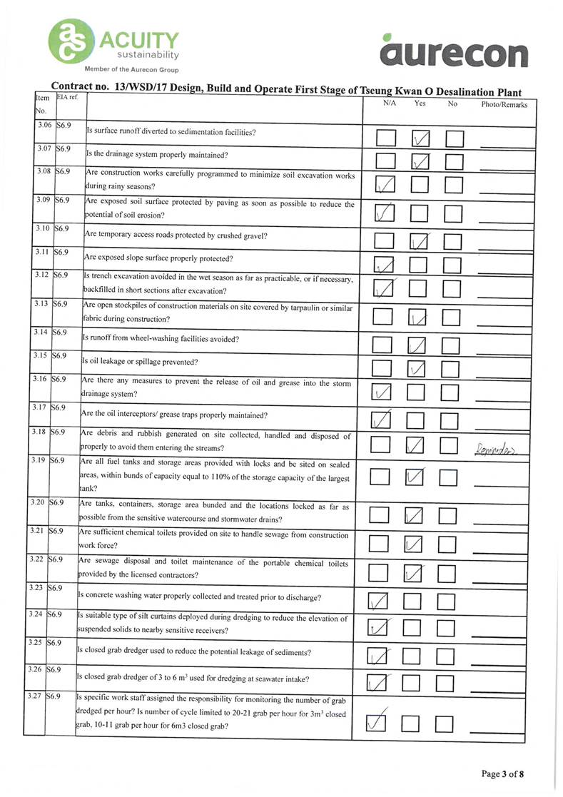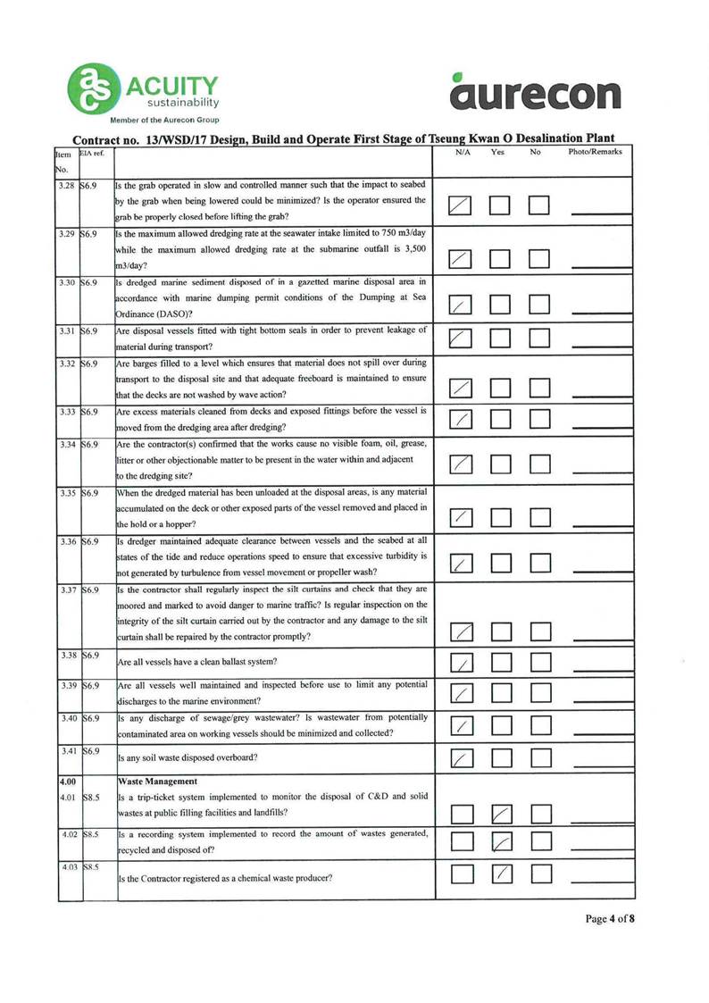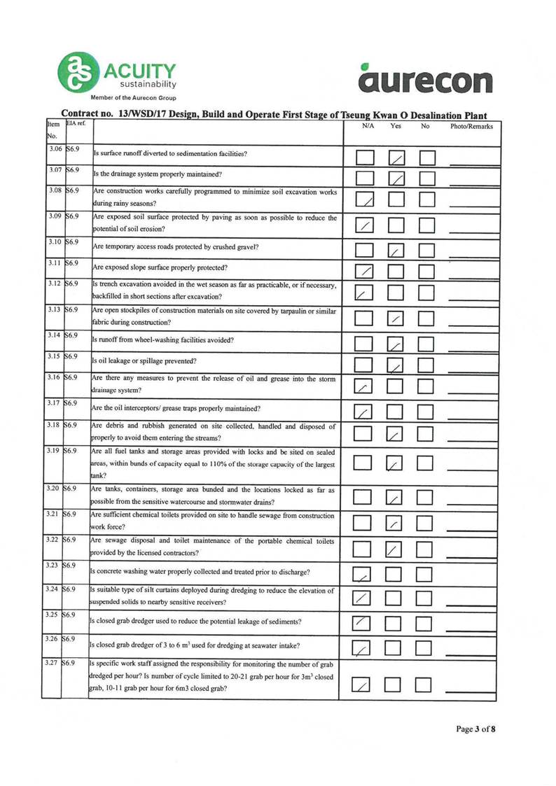 A2. In accordance with the Environmental Monitoring and Audit (EM&A) Manual for the Contract, EM&A works for marine water quality, noise, waste management and ecology should be carried out by Environmental Team (ET), Acuity Sustainability Consulting Limited (ASCL), during the construction phase of the Contract.
