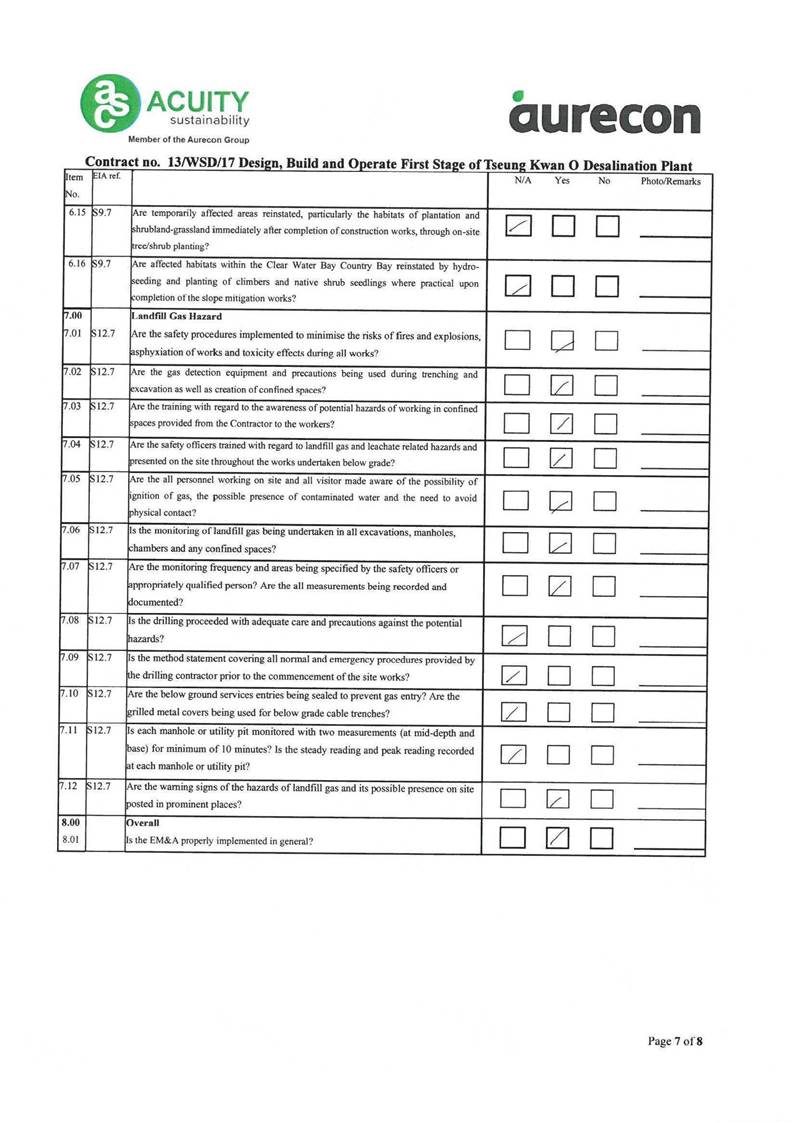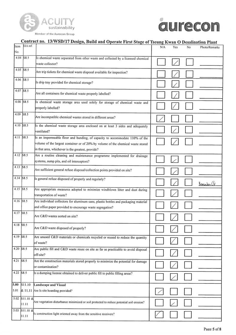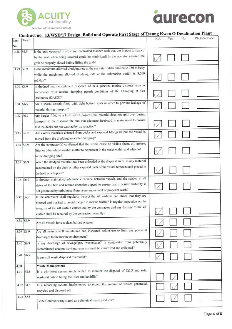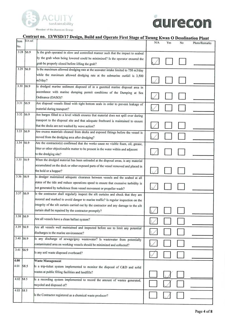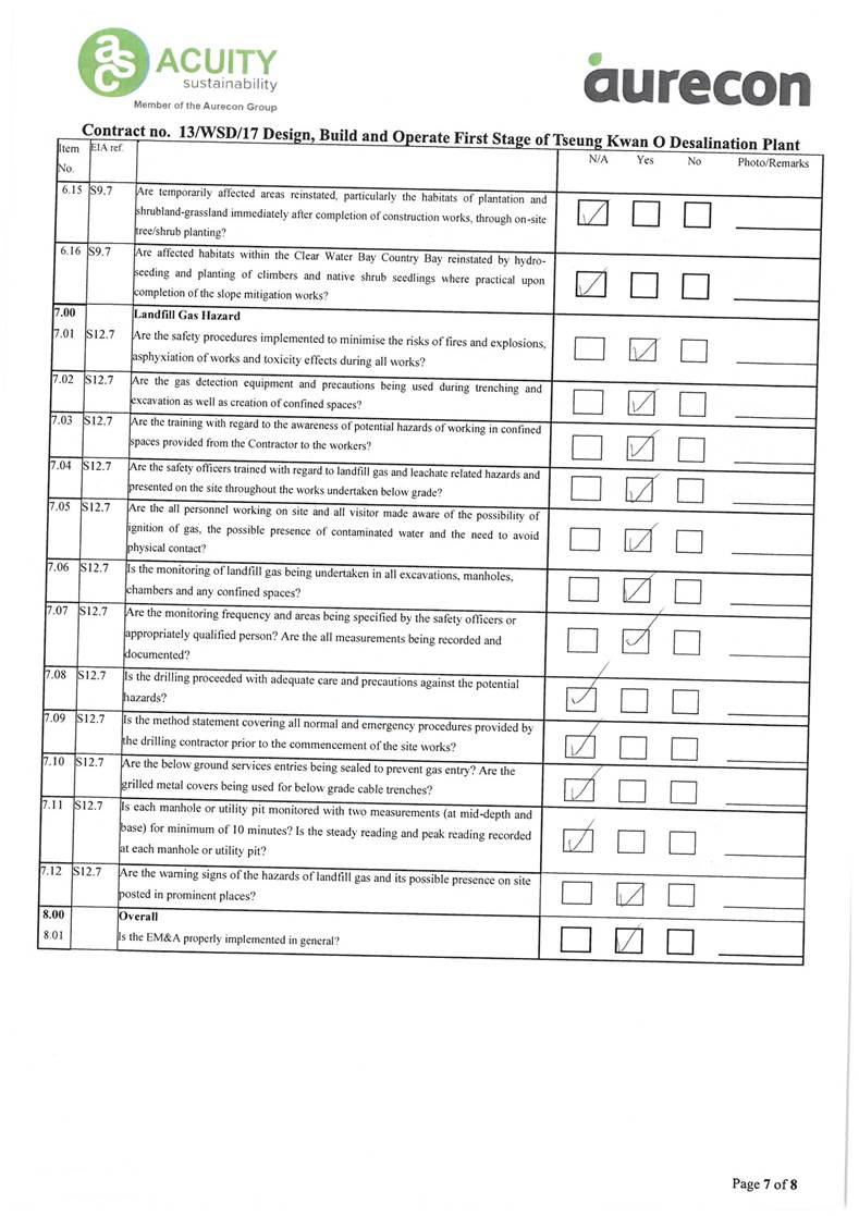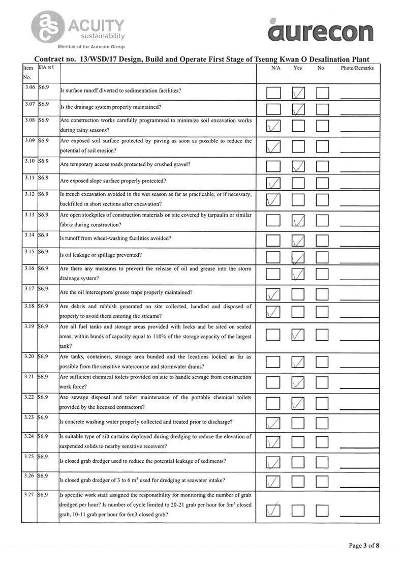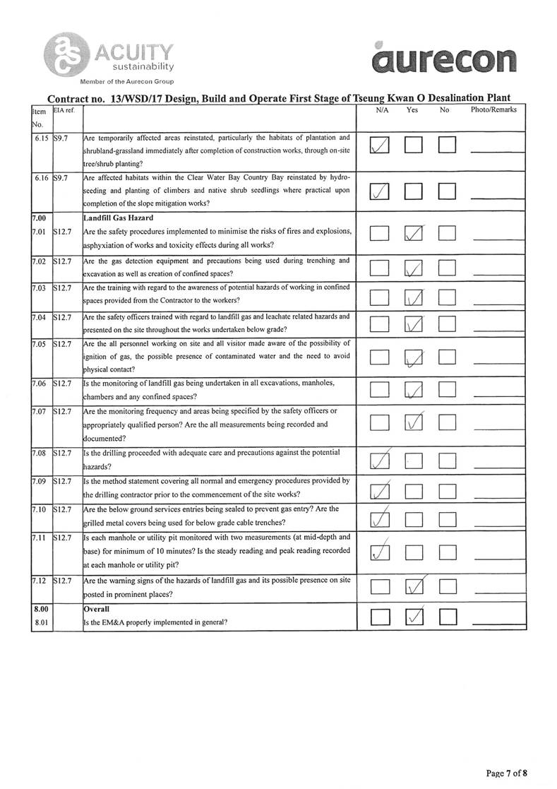 A2. In accordance with the Environmental Monitoring and Audit (EM&A) Manual for the Contract, EM&A works for marine water quality, noise, waste management and ecology should be carried out by Environmental Team (ET), Acuity Sustainability Consulting Limited (ASCL), during the construction phase of the Contract.