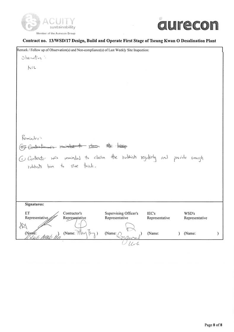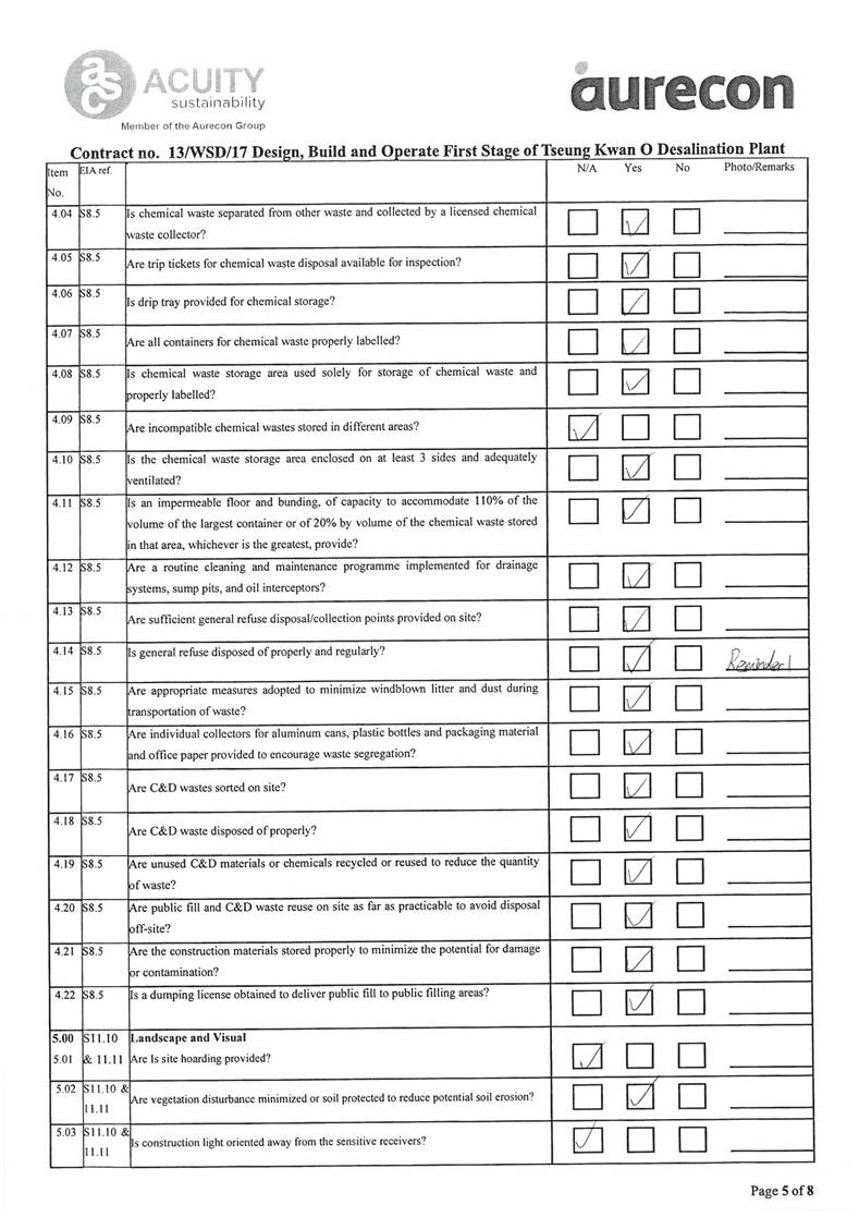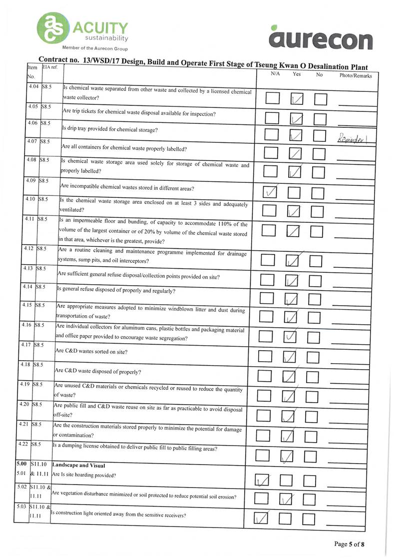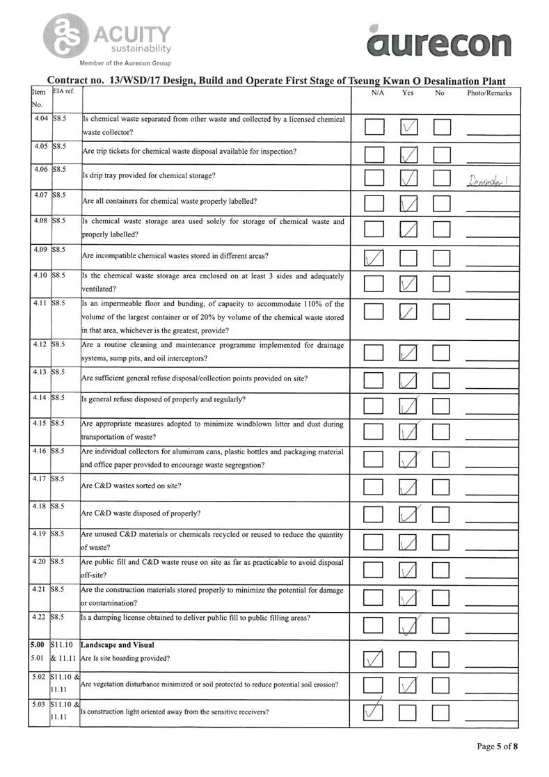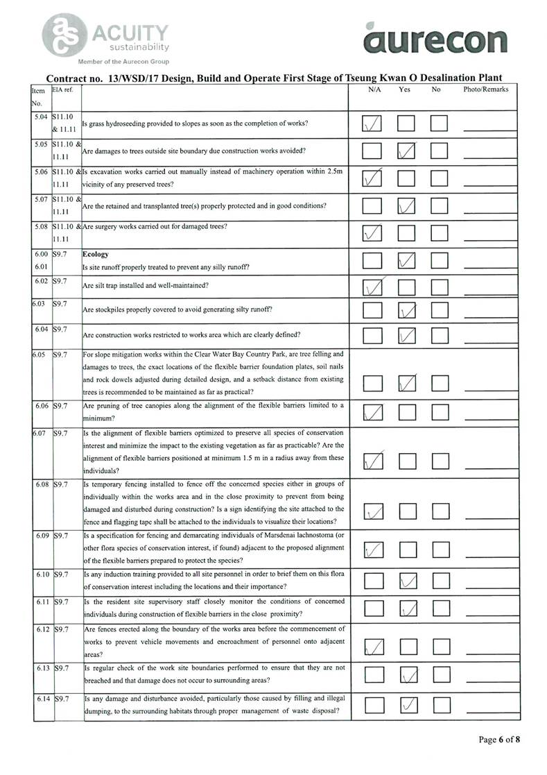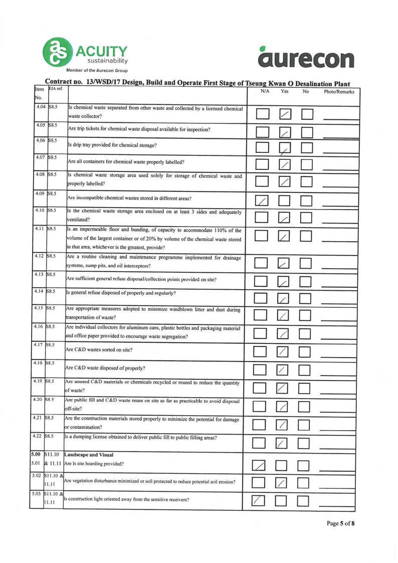 A2. In accordance with the Environmental Monitoring and Audit (EM&A) Manual for the Contract, EM&A works for marine water quality, noise, waste management and ecology should be carried out by Environmental Team (ET), Acuity Sustainability Consulting Limited (ASCL), during the construction phase of the Contract.