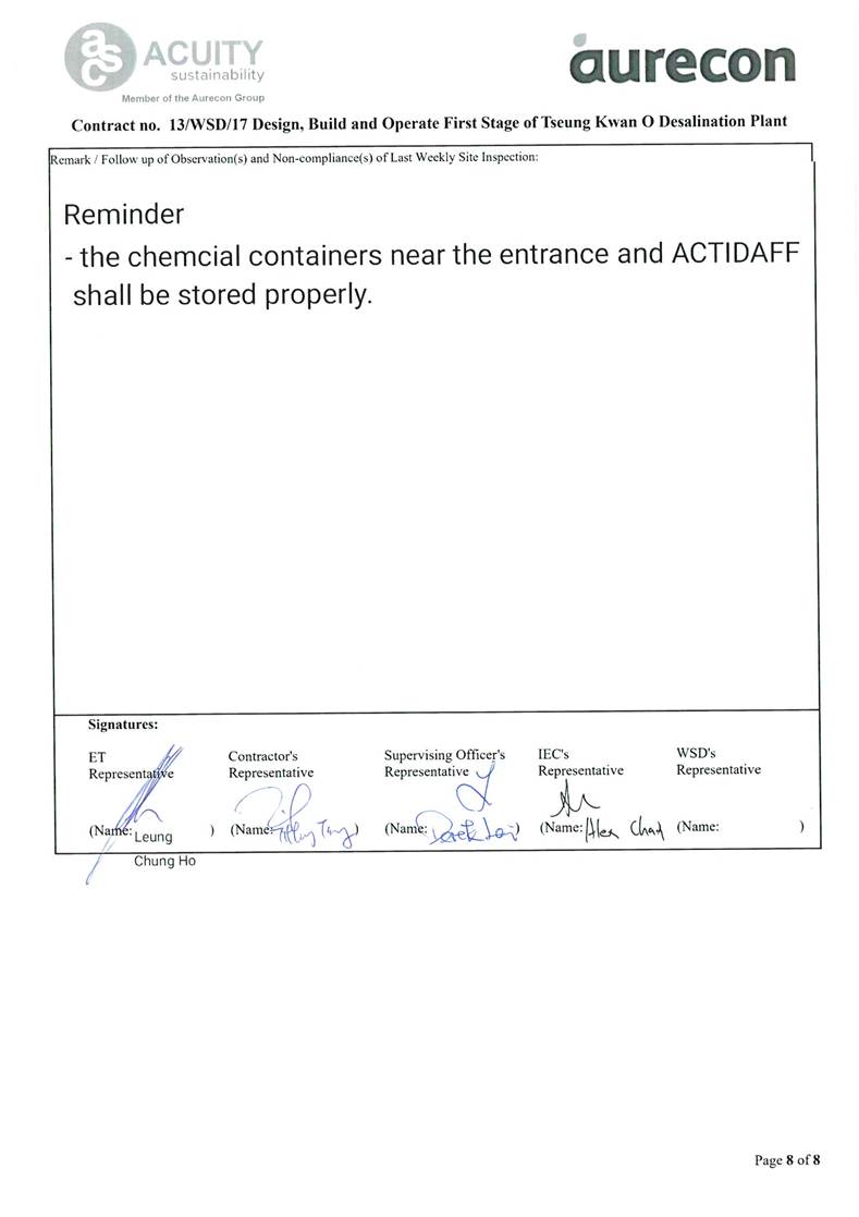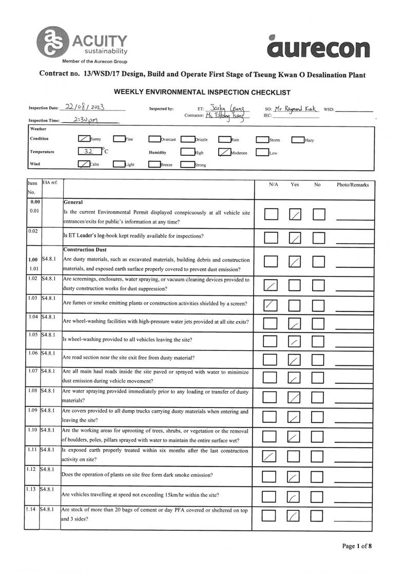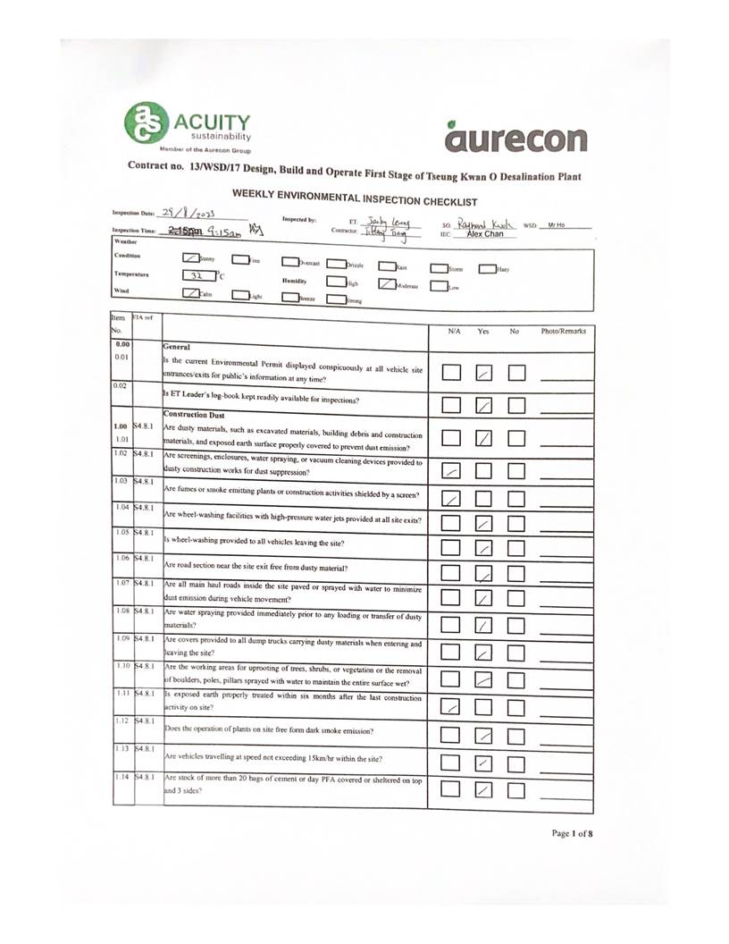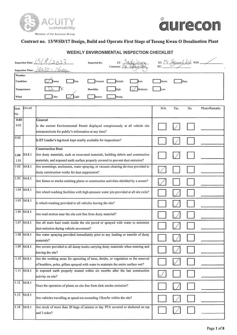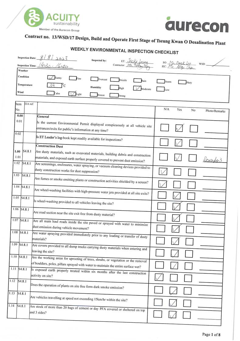 A1. The Project, Design, Build and Operate First Stage of Tseung Kwan O Desalination Plant (TKODP), is a Designated Project under the Environmental Impact Assessment Ordinance (Cap. 499) (EIAO) and is currently governed by a Further Environmental Permit (EP No. FEP - 01/503/2015/A) for the construction and operation of the Contract.