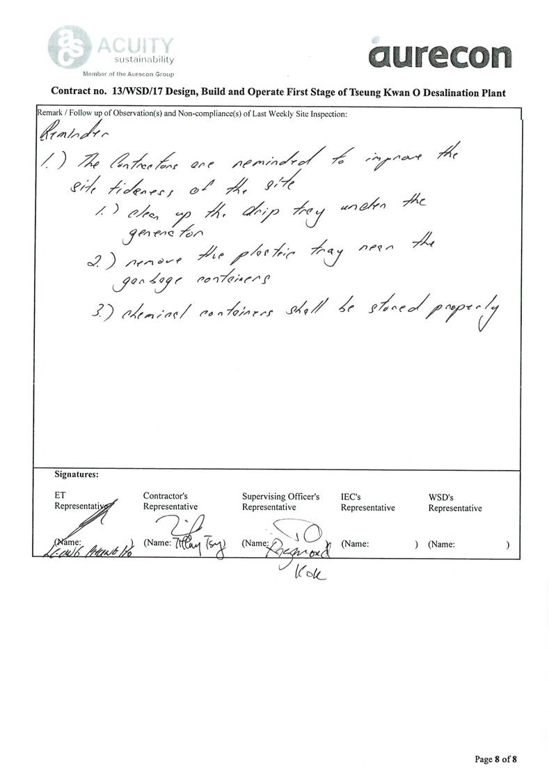 - Deployment of temporary silt curtain in the area where marine construction works were conducted and deployment of water sedimentation tanks for treatment of wastewater at inland and marine areas before discharge; and