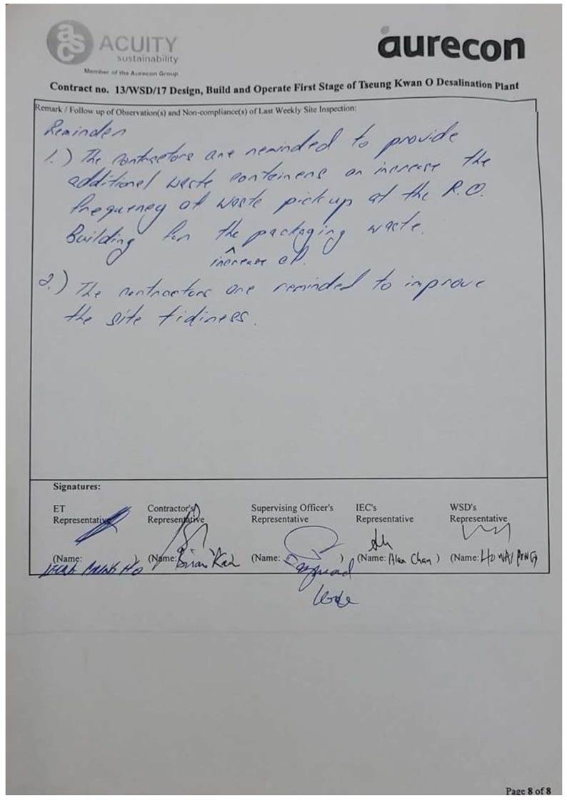 - Deployment of temporary silt curtain in the area where marine construction works were conducted and deployment of water sedimentation tanks for treatment of wastewater at inland and marine areas before discharge.