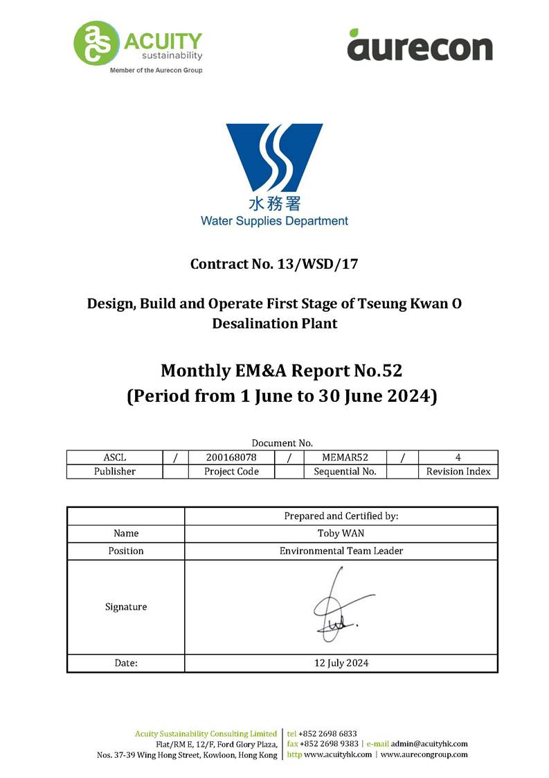 A3. This is the 52nd Monthly EM&A Report, prepared by ASCL, for the Contract summarizing the monitoring results and audit findings of the EM&A programme at and around Tseung Kwan O Area 137 (TKO 137) during the reporting period from 1 June to 30 June 2024.