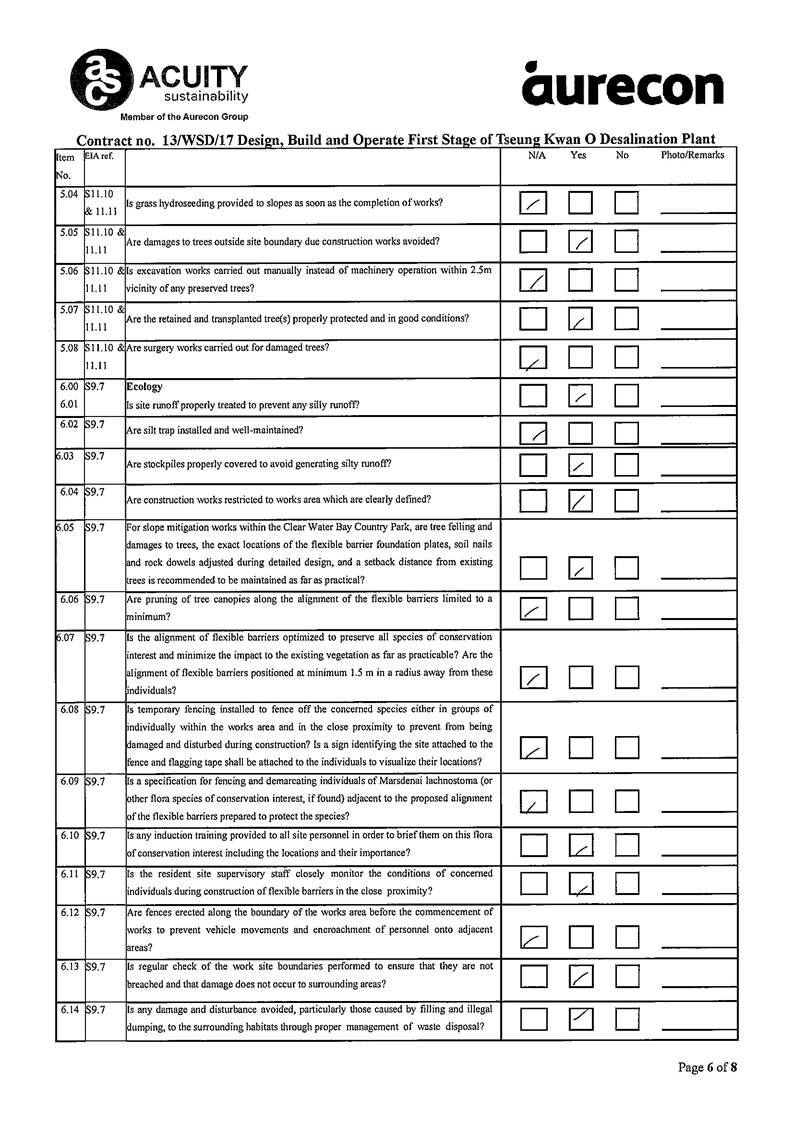 A2. In accordance with the Environmental Monitoring and Audit (EM&A) Manual for the Contract, EM&A works for marine water quality, noise, waste management and ecology should be carried out by Environmental Team (ET), Acuity Sustainability Consulting Limited (ASCL), during the construction phase of the Contract.