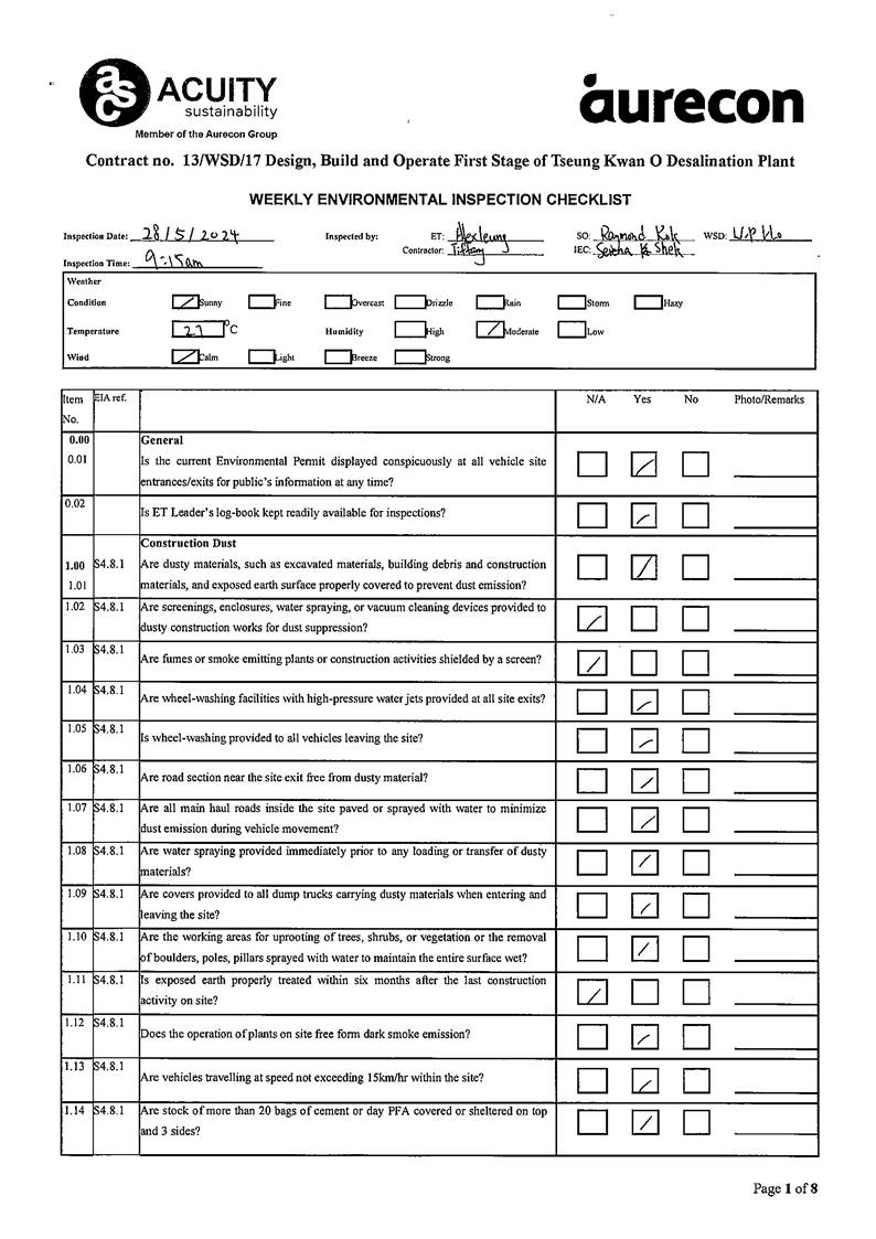 A15. Joint site inspections of the construction work by ET and IEC were carried out on 28 May 2024 to audit the mitigation measures implementation status. Reminders were recorded in the site inspection checklists and provided to the contractors together with the appropriate follow-up actions where necessary.