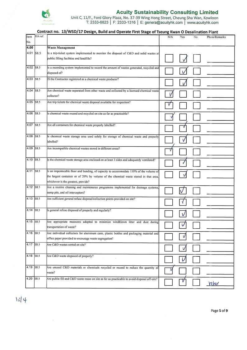 A13. Weekly site inspections of the construction work by ET were carried out on 7, 13, 20 and 30 April 2021 to audit the mitigation measures implementation status. Bi-weekly joint site inspection was carried out on 13 & 30 April 2021 by ET and IEC. Observations were recorded in the site inspection checklists and provided to the contractors together with the appropriate follow-up actions where necessary.