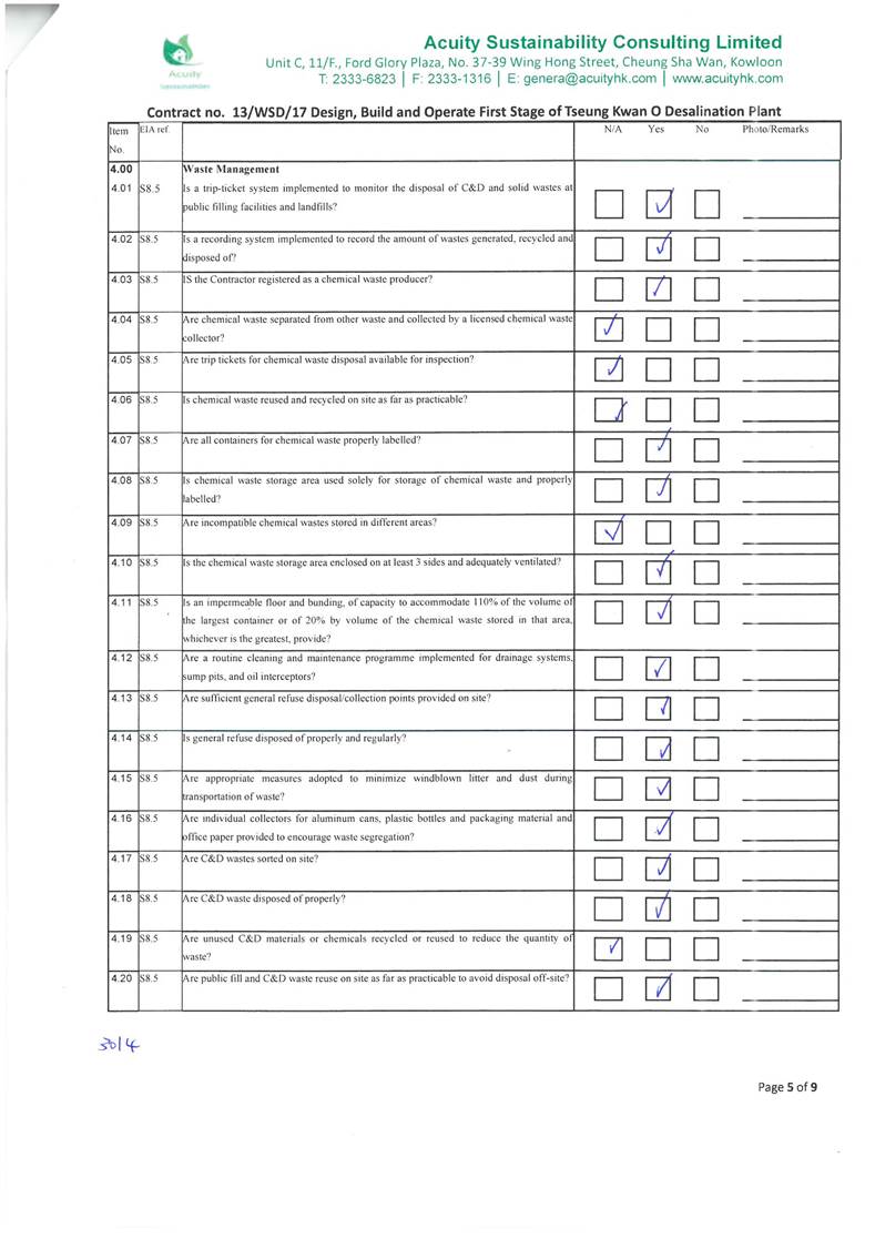 A2. In accordance with the Environmental Monitoring and Audit (EM&A) Manual for the Project, EM&A works for marine water quality, noise, waste management and ecology should be carried out by Environmental Team (ET), Acuity Sustainability Consulting Limited (ASCL), during the construction phase of the Project.
