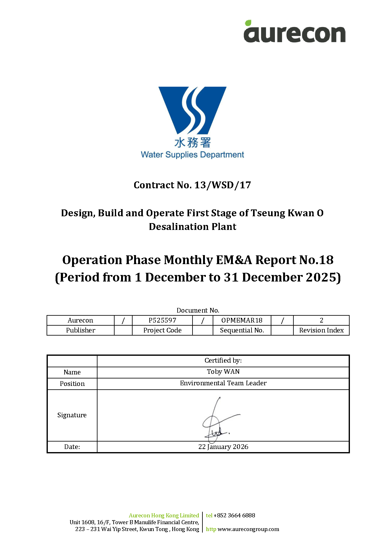 A3. The TKODP commenced the operation stage on 1 July 2024. This is the 18th Operation Phase Monthly EM&A Report, prepared by Aurecon, for the Contract summarizing the monitoring results and audit findings of the EM&A programme at and around Tseung Kwan O Area 137 (TKO 137) during operation of Tseung Kwan O Desalination Plant in December 2025.