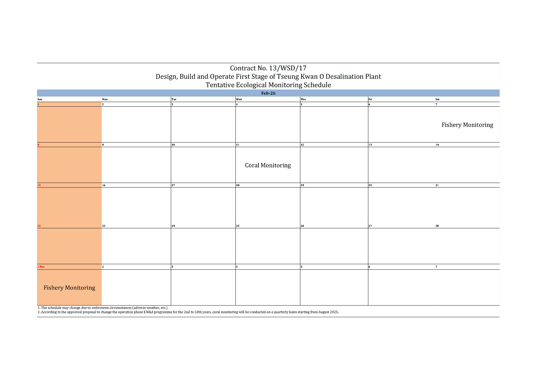 A8. According to the approved proposal to change the operation phase EM&A programme for the 2nd to 10th year, coral monitoring will be conducted on a quarterly basis starting from August 2025.
