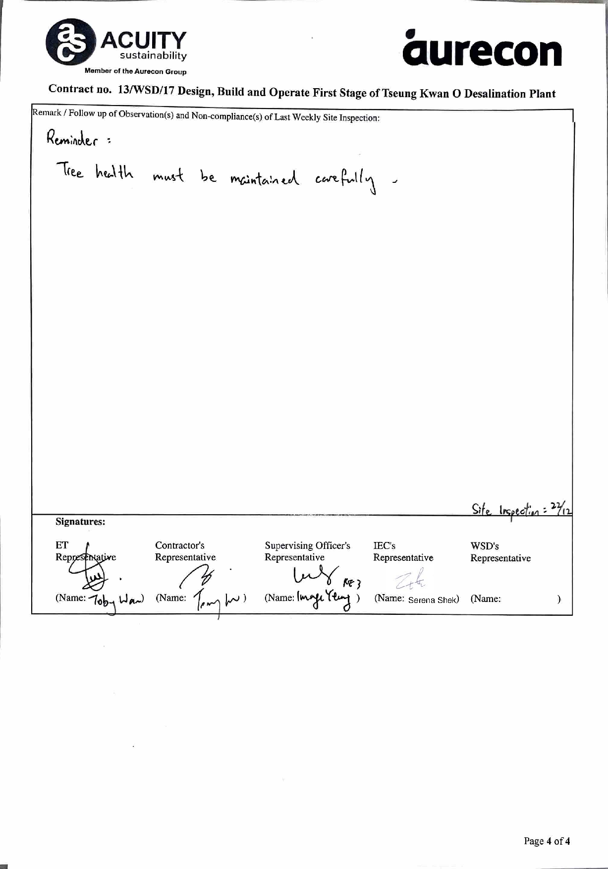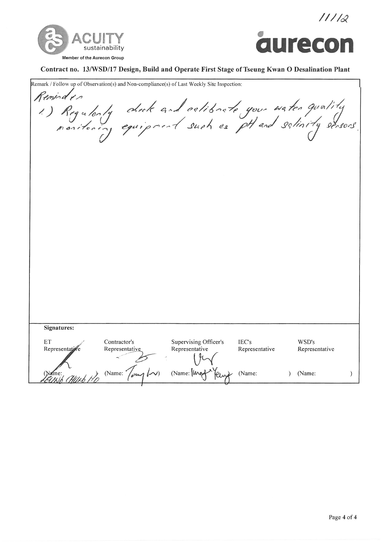 A2. In accordance with the Environmental Monitoring and Audit (EM&A) Manual for the Contract, EM&A works for marine water quality, waste management and ecology should be carried out by Environmental Team (ET), Aurecon Hong Kong Limited (Aurecon), during the Tseung Kwan O Desalination Plant.
