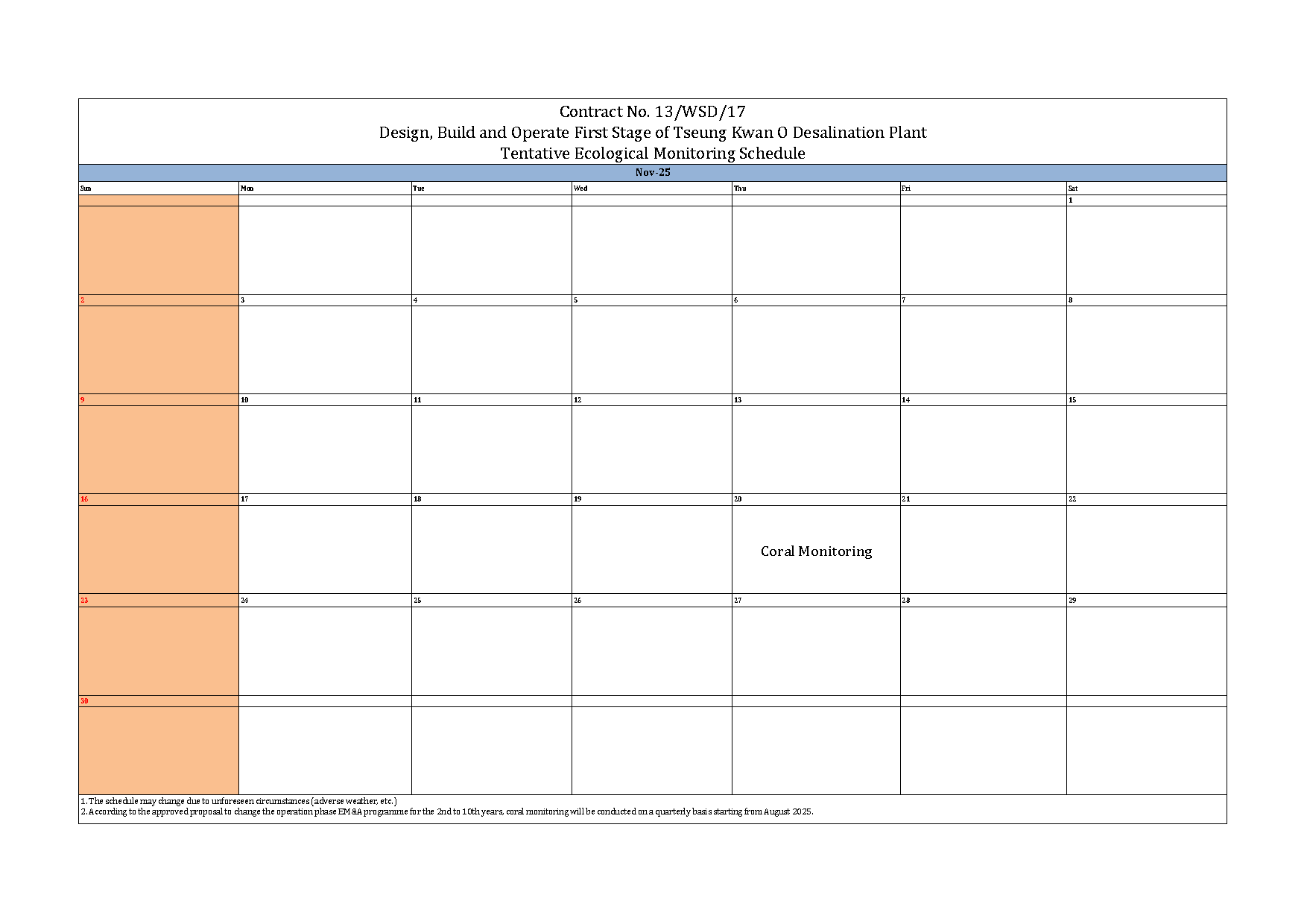 A9. According to the approved proposal to change the operation phase EM&A programme for the 2nd to 10th year, coral monitoring will be conducted on a quarterly basis starting from August 2025.