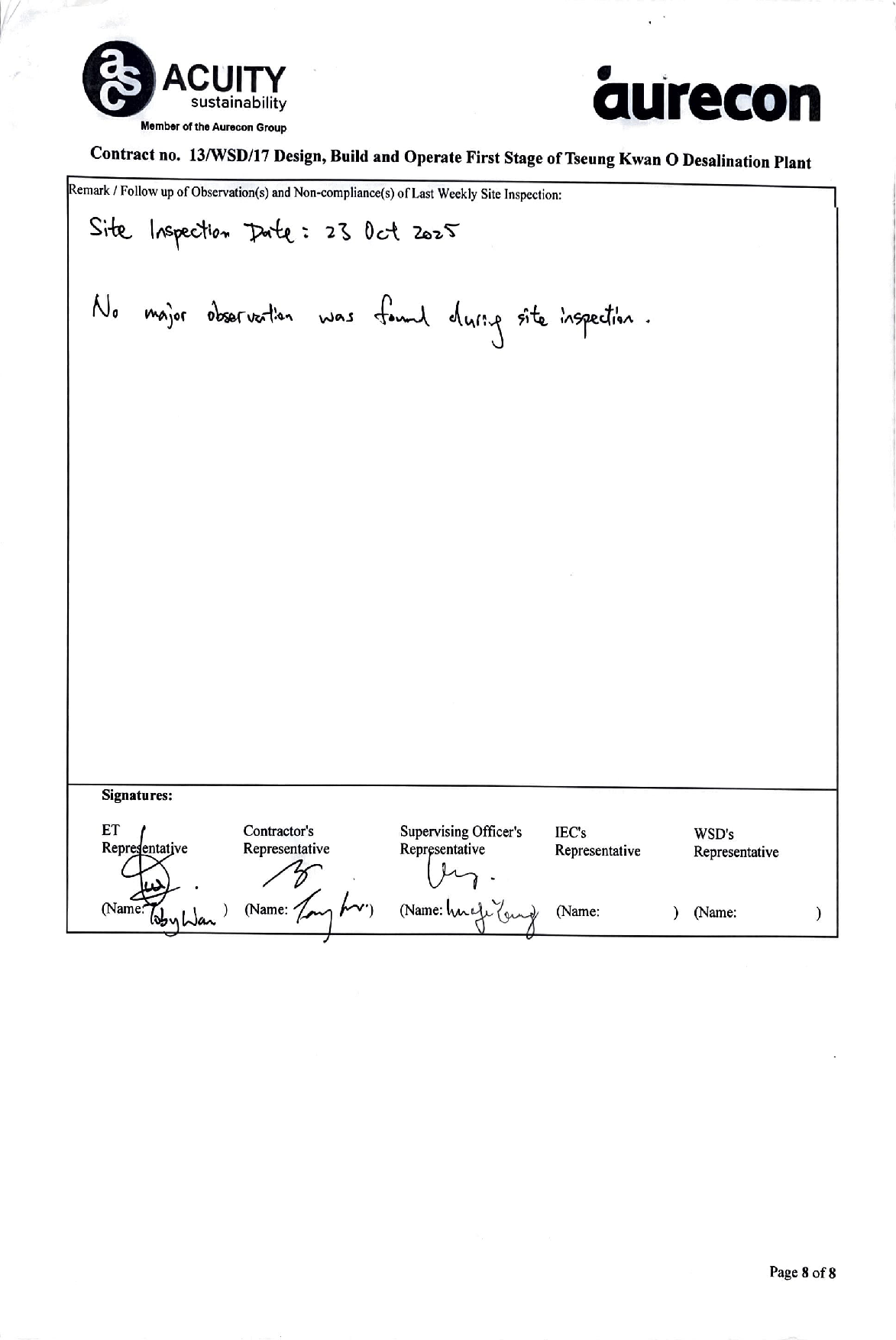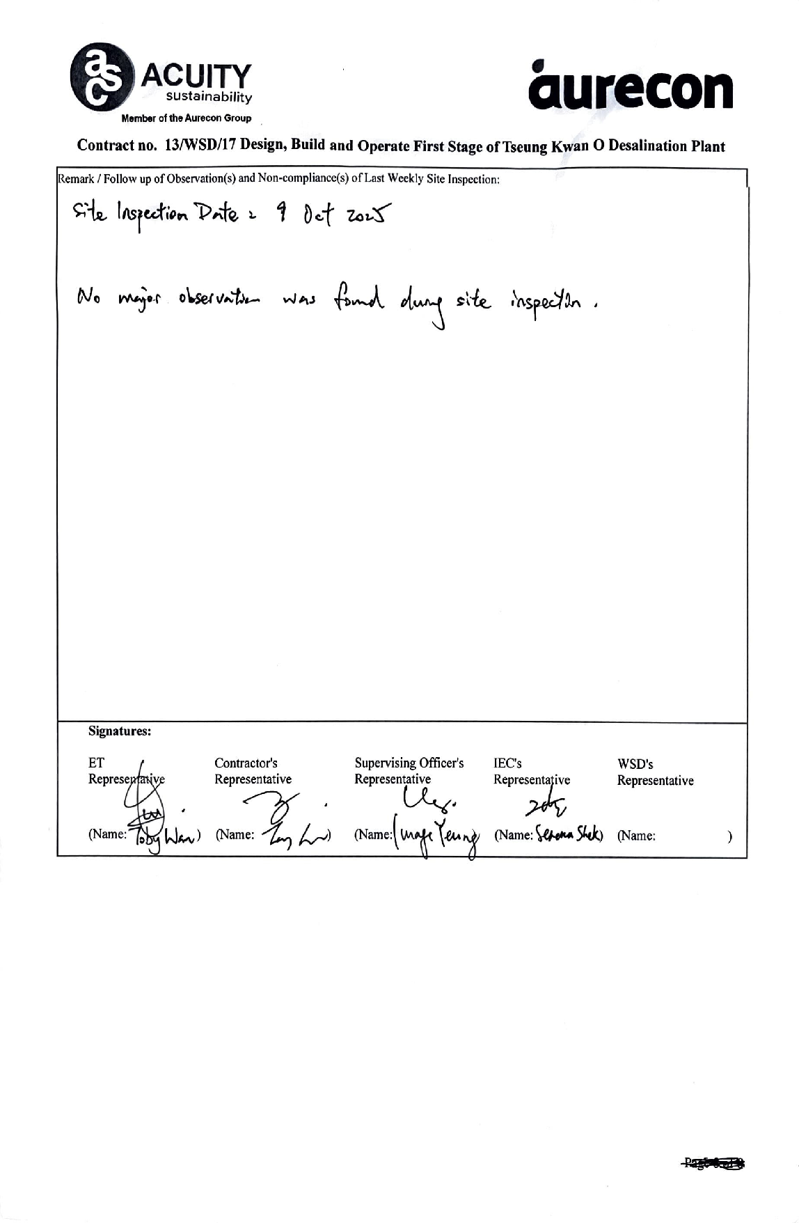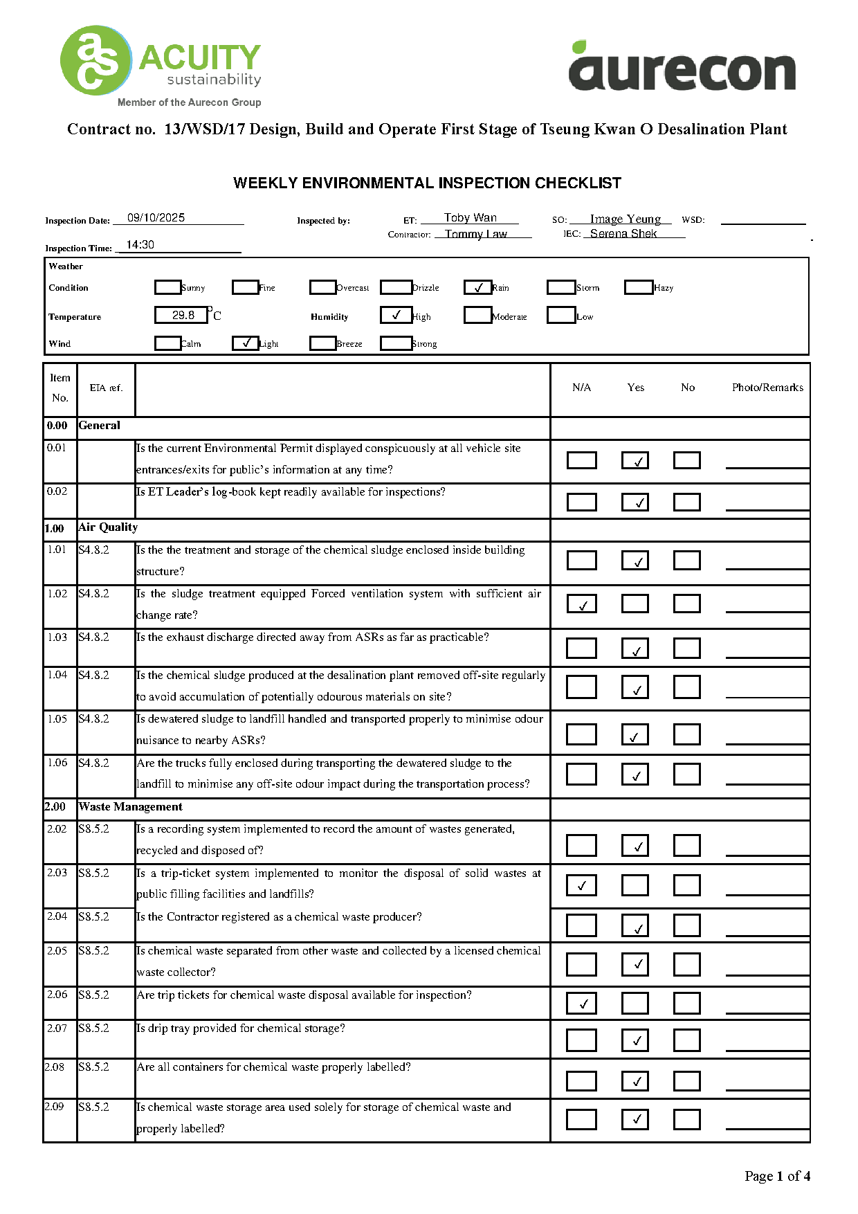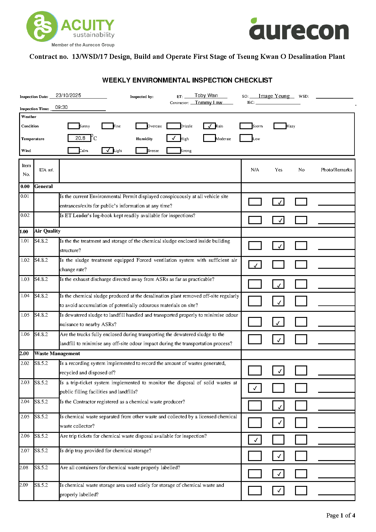 A2. In accordance with the Environmental Monitoring and Audit (EM&A) Manual for the Contract, EM&A works for marine water quality, waste management and ecology should be carried out by Environmental Team (ET), Aurecon Hong Kong Limited (Aurecon), during the Tseung Kwan O Desalination Plant.