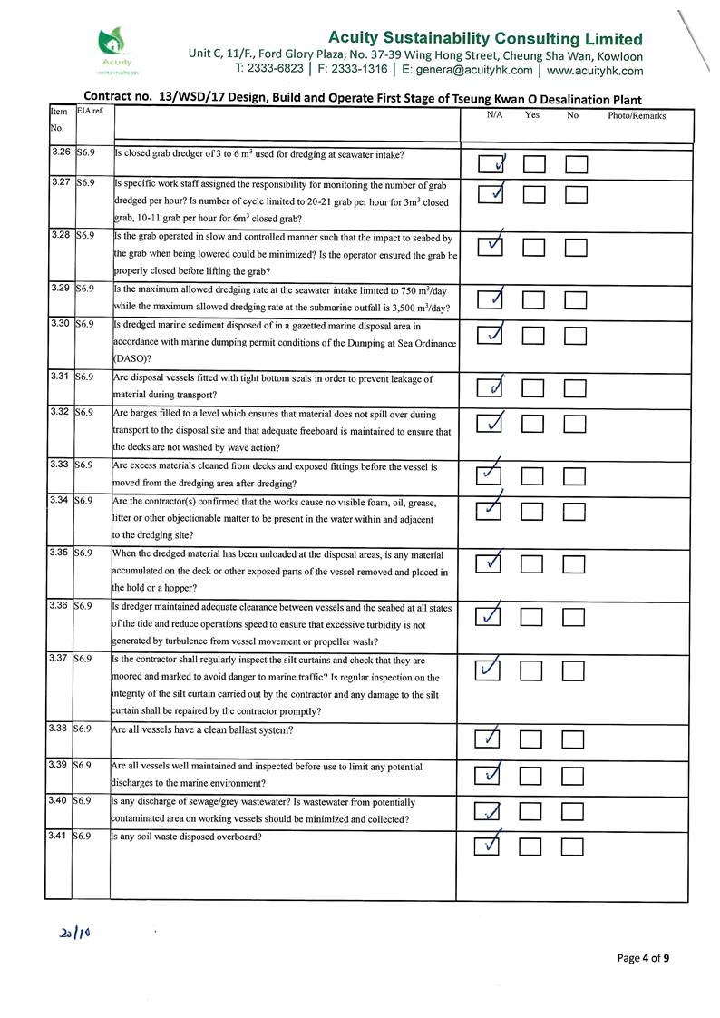 A2. In accordance with the Updated Environmental Monitoring and Audit (EM&A) Manual for the Project, EM&A works for marine water quality, noise, waste management and ecology should be carried out by Environmental Team (ET), Acuity Sustainability Consulting Limited (ASCL), during the construction phase of the Project.