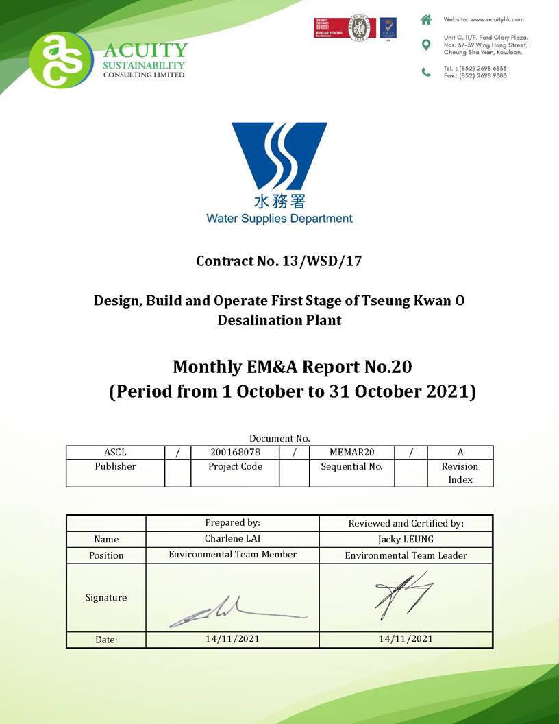 EM&A Report, prepared by ASCL, for the Project summarizing the monitoring results and audit findings of the EM&A