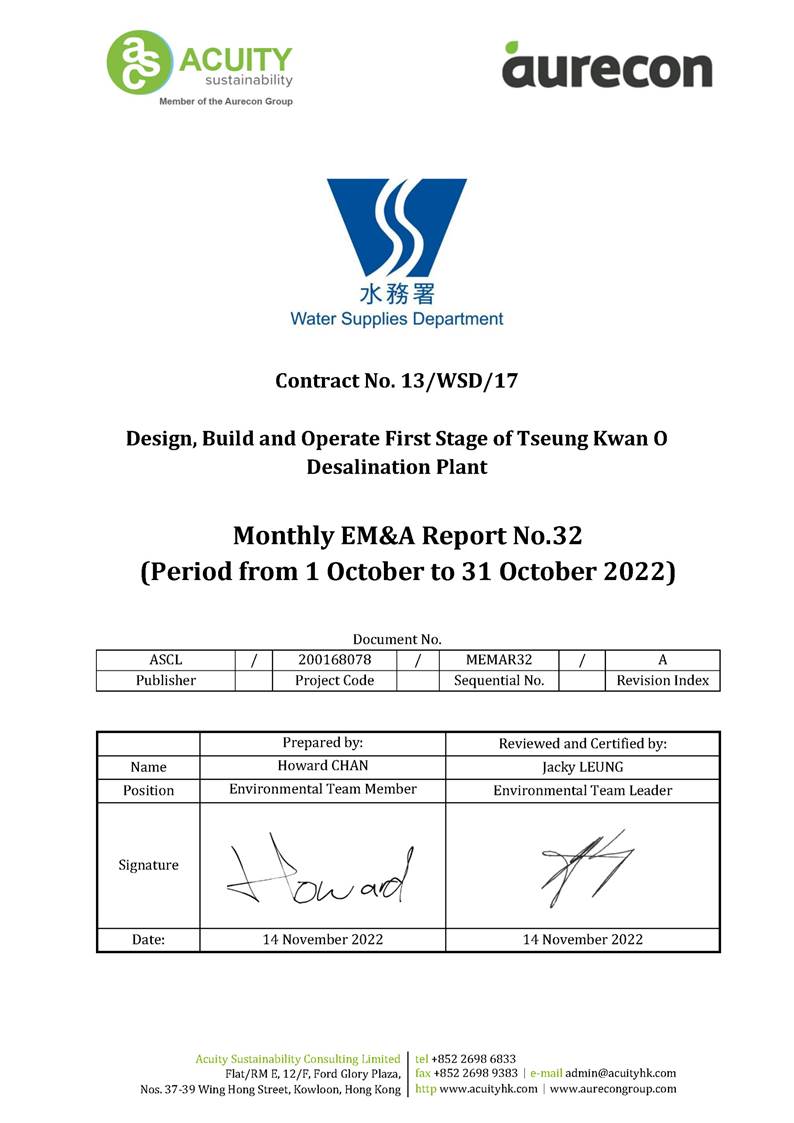 A3. This is the 32nd Monthly EM&A Report, prepared by ASCL, for the Contract summarizing the monitoring results and audit findings of the EM&A programme at and around Tseung Kwan O Area 137 (TKO 137) during the reporting period from 1 October 2022 to 31 October 2022.