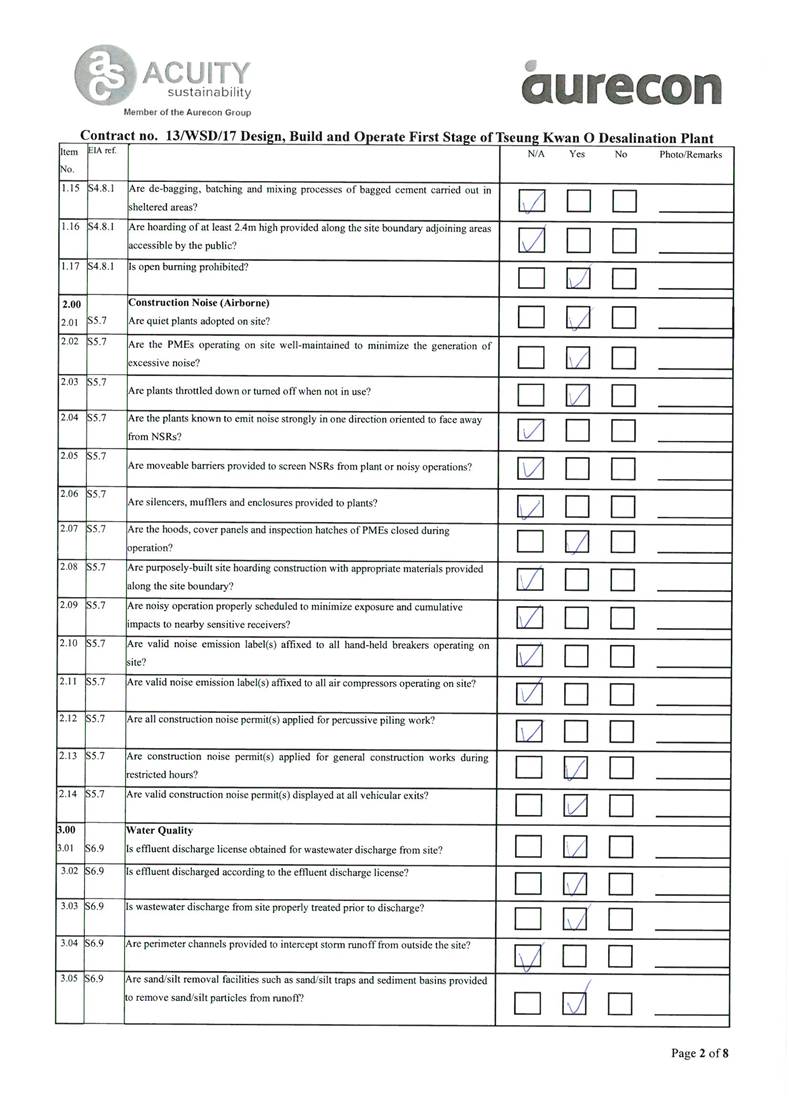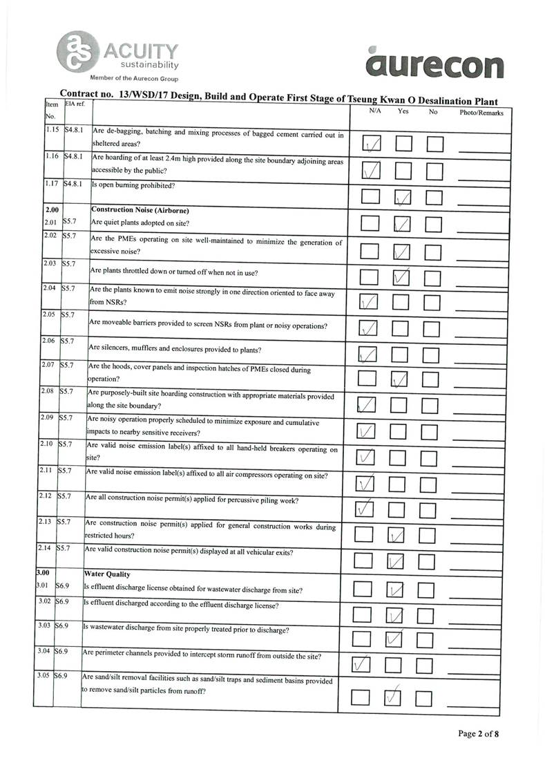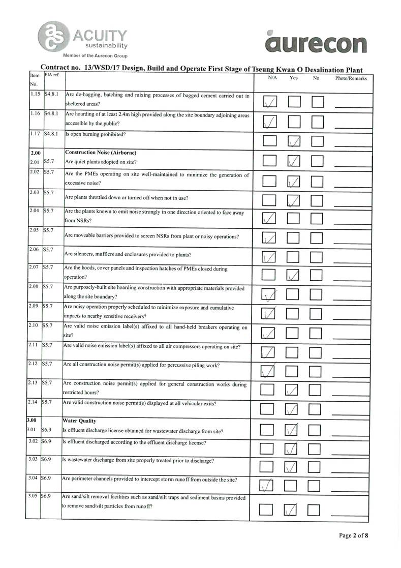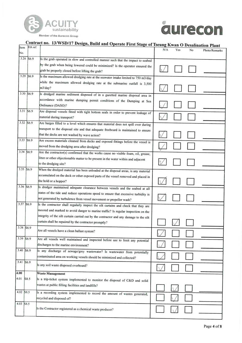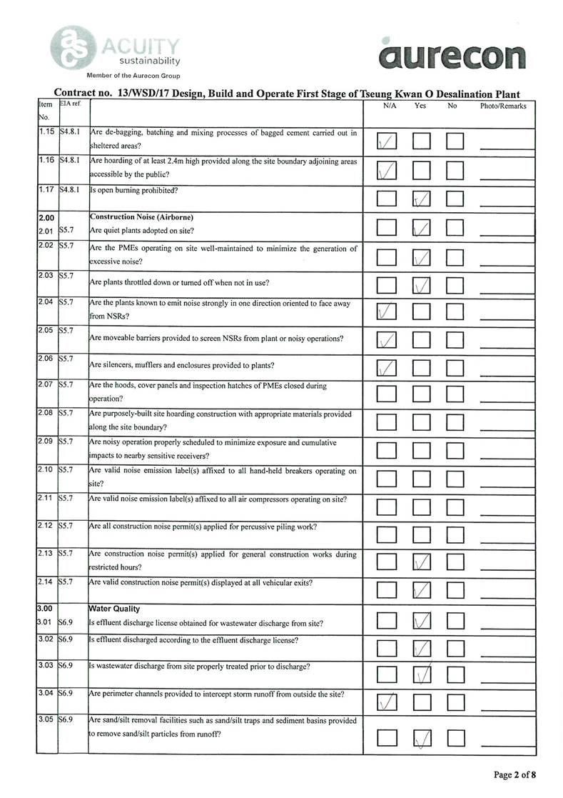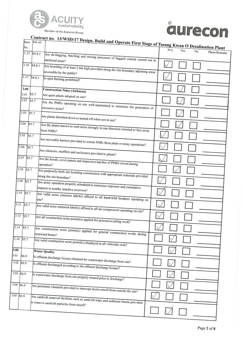 A2. In accordance with the Environmental Monitoring and Audit (EM&A) Manual for the Contract, EM&A works for marine water quality, noise, waste management and ecology should be carried out by Environmental Team (ET), Acuity Sustainability Consulting Limited (ASCL), during the construction phase of the Contract.