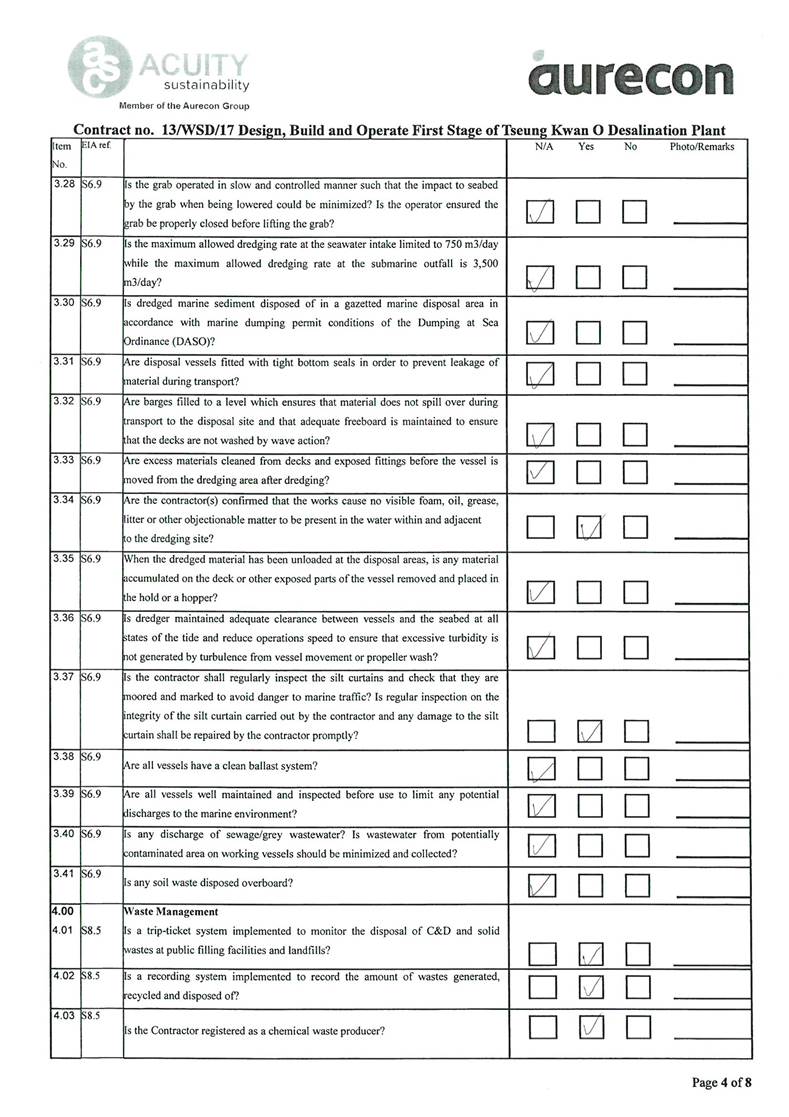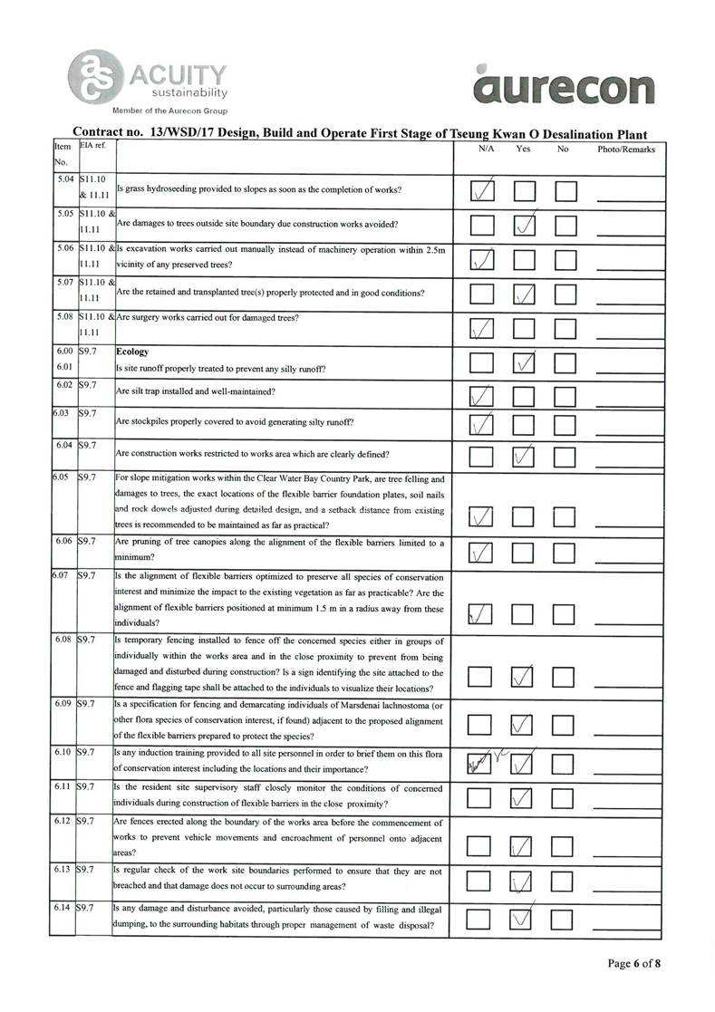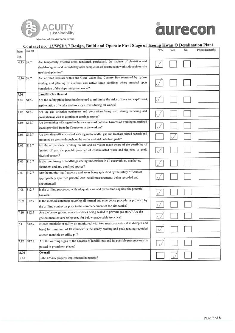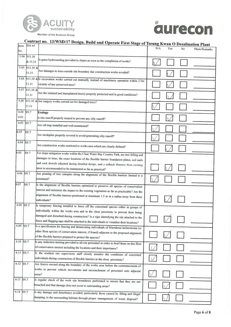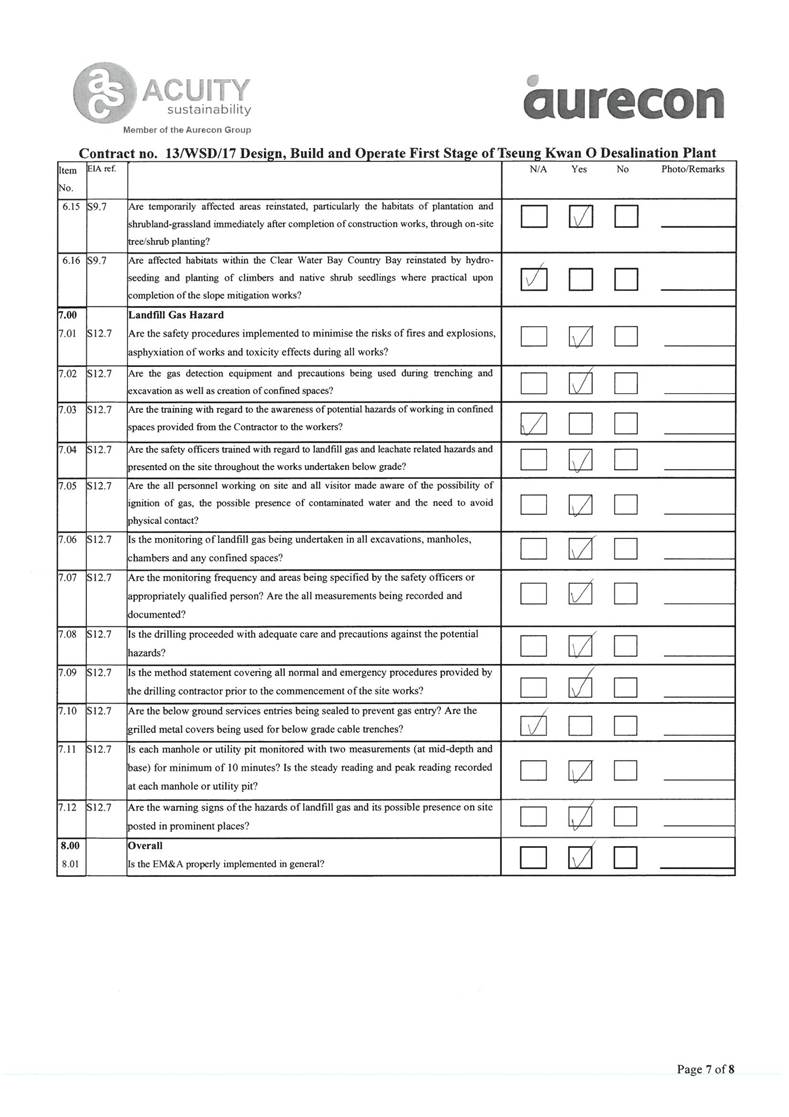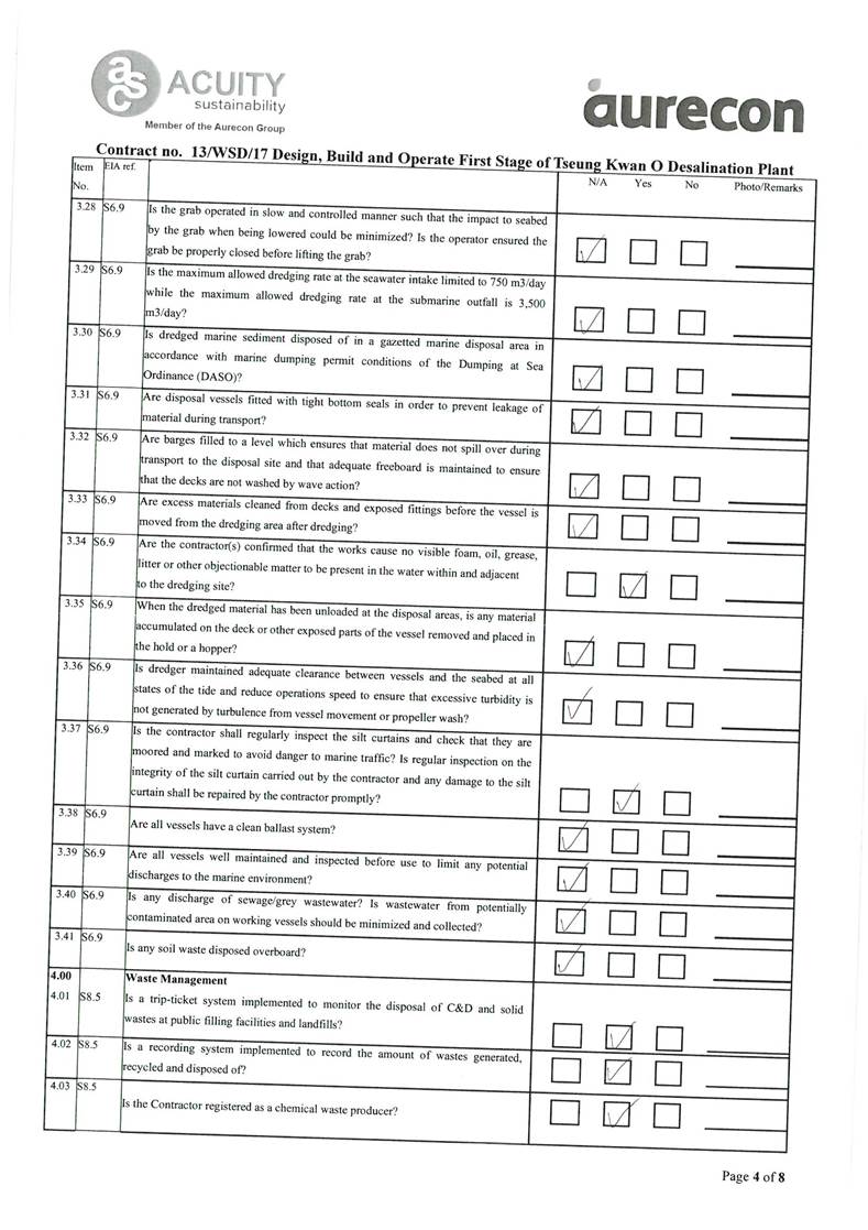 A2. In accordance with the Environmental Monitoring and Audit (EM&A) Manual for the Contract, EM&A works for marine water quality, noise, waste management and ecology should be carried out by Environmental Team (ET), Acuity Sustainability Consulting Limited (ASCL), during the construction phase of the Contract.