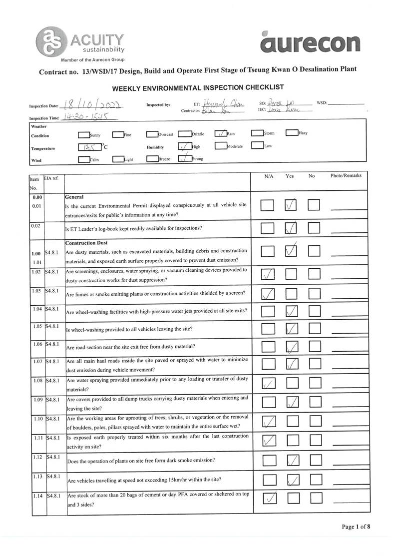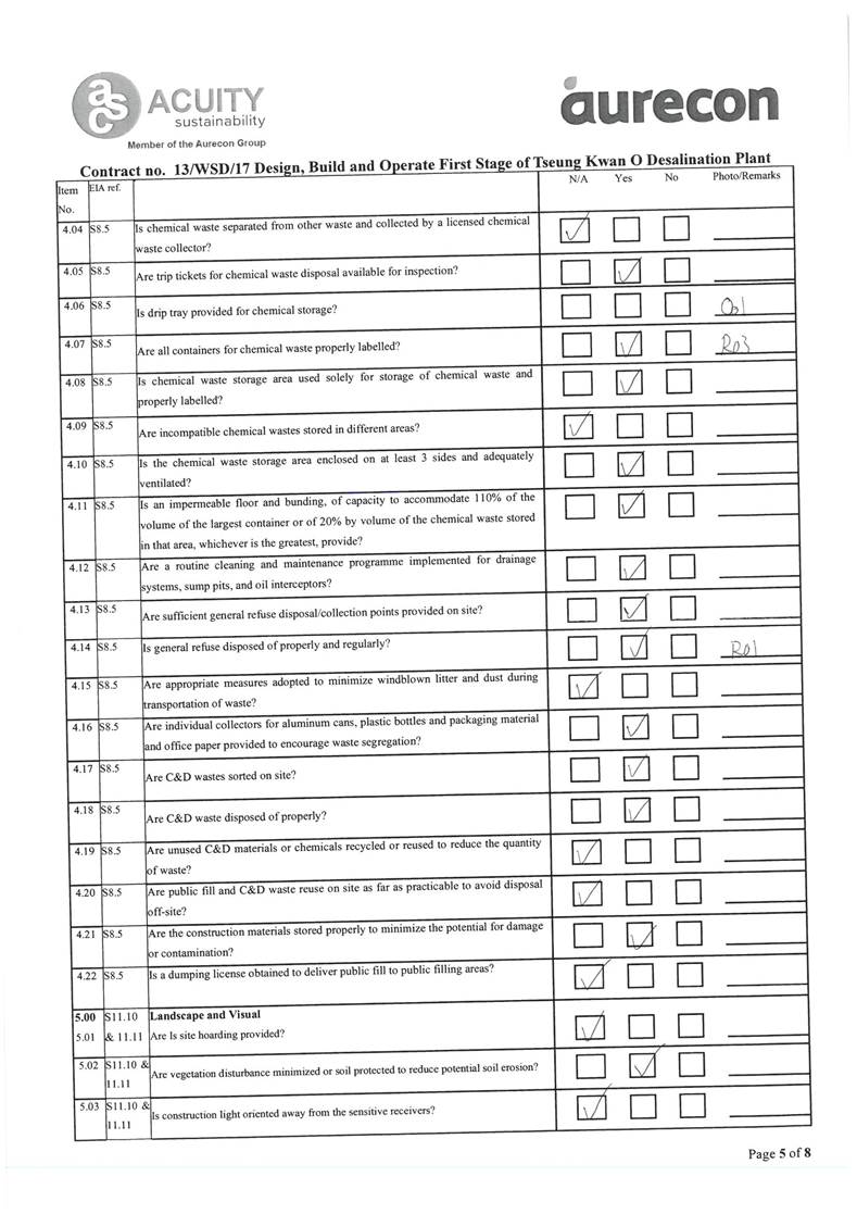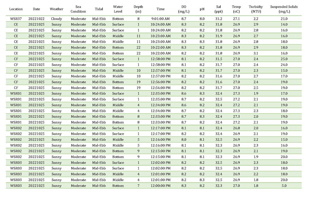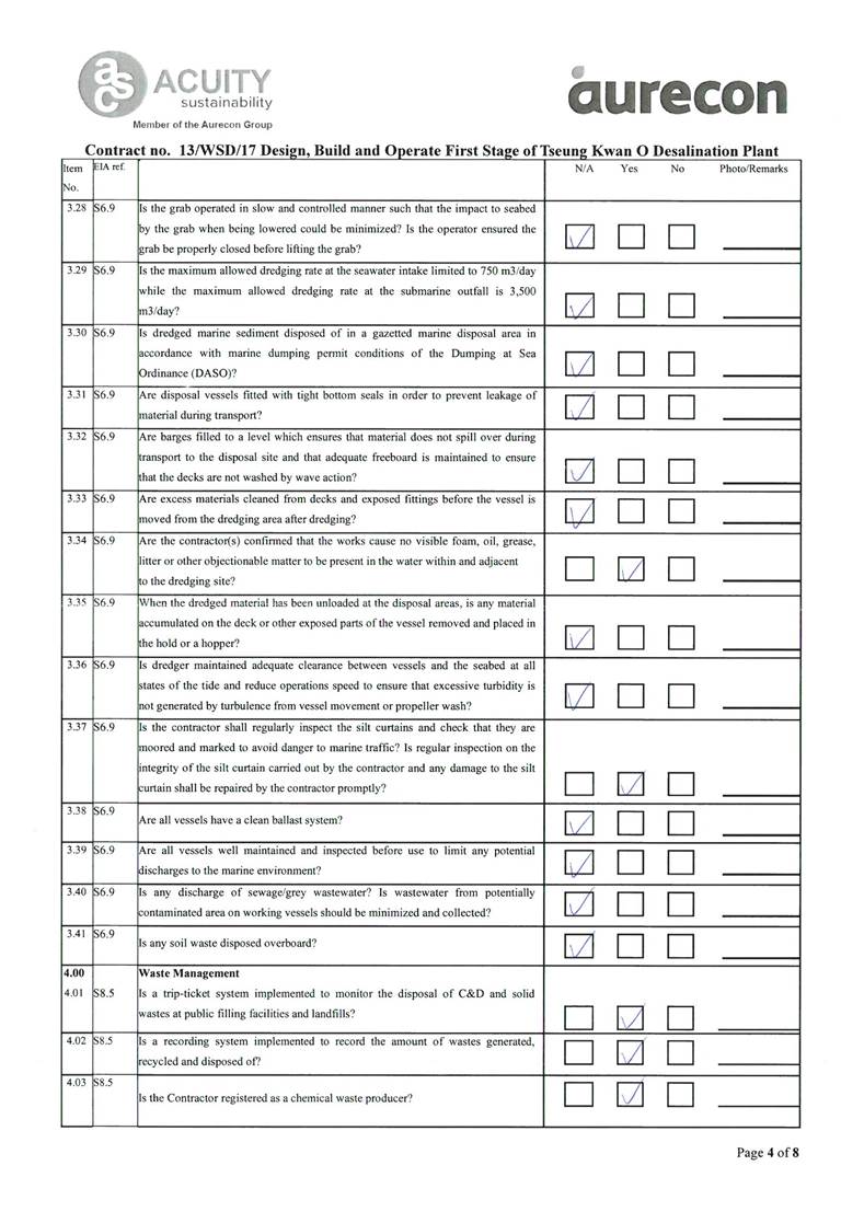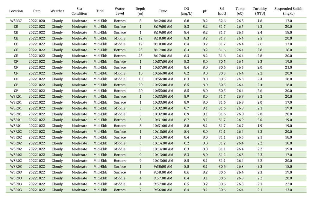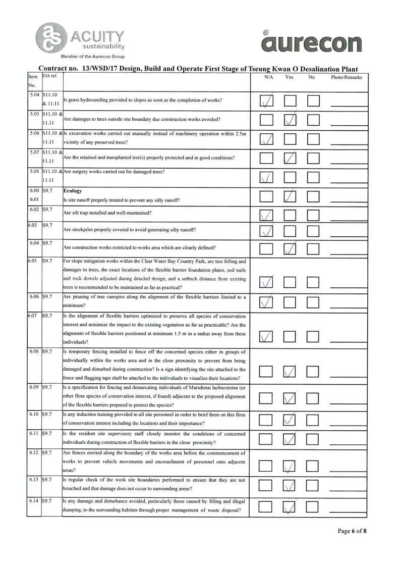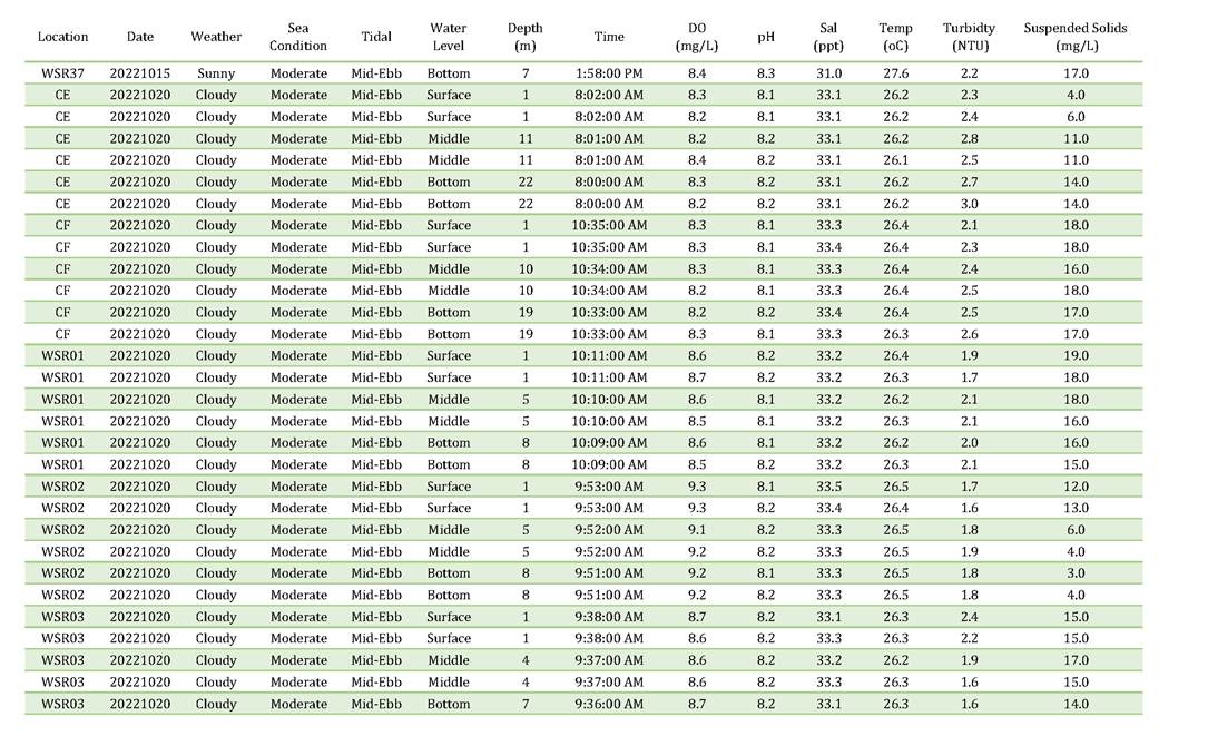 A2. In accordance with the Environmental Monitoring and Audit (EM&A) Manual for the Contract, EM&A works for marine water quality, noise, waste management and ecology should be carried out by Environmental Team (ET), Acuity Sustainability Consulting Limited (ASCL), during the construction phase of the Contract.