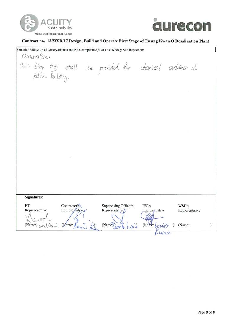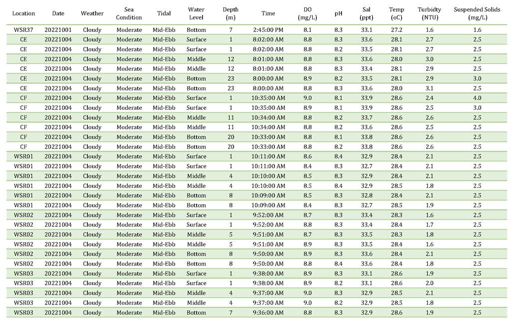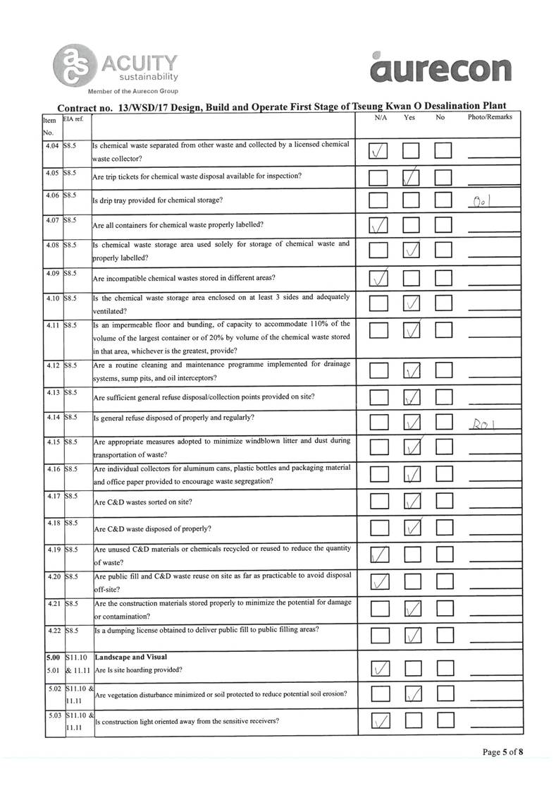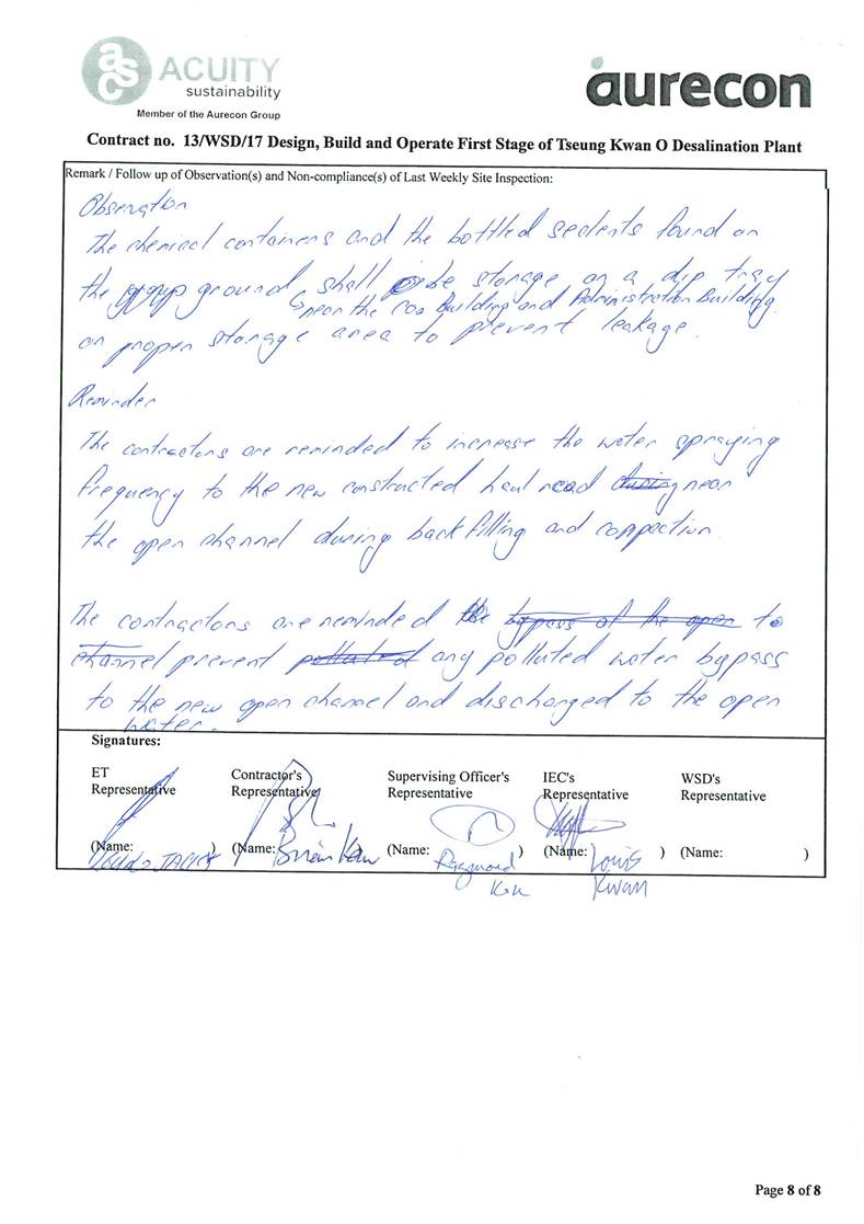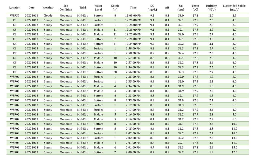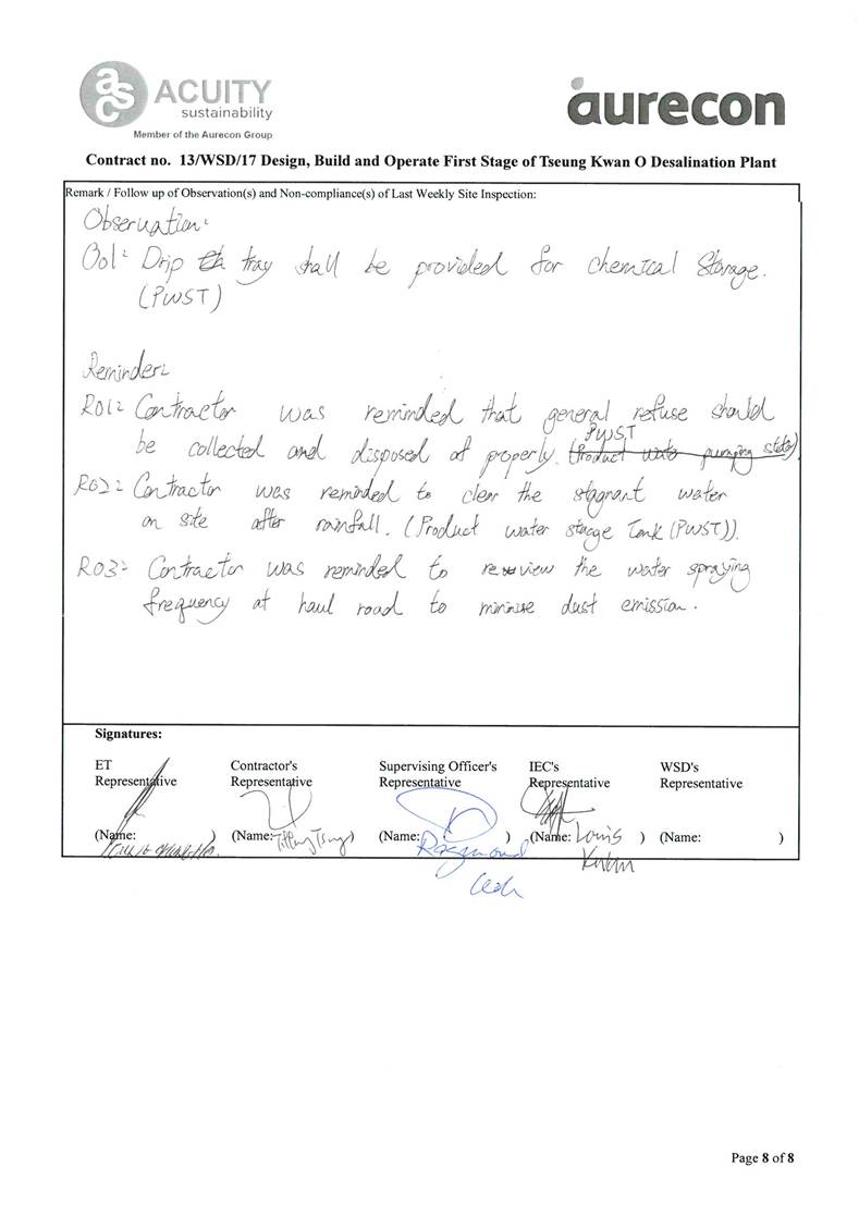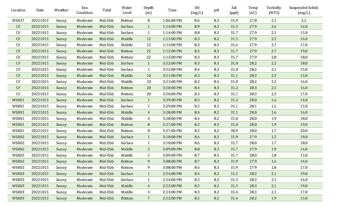 A2. In accordance with the Environmental Monitoring and Audit (EM&A) Manual for the Contract, EM&A works for marine water quality, noise, waste management and ecology should be carried out by Environmental Team (ET), Acuity Sustainability Consulting Limited (ASCL), during the construction phase of the Contract.
