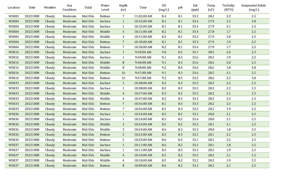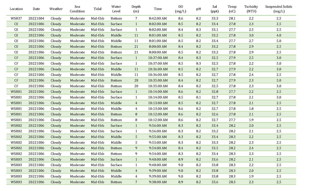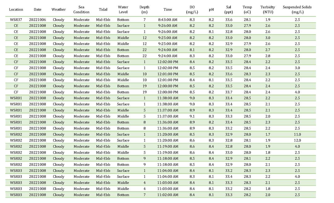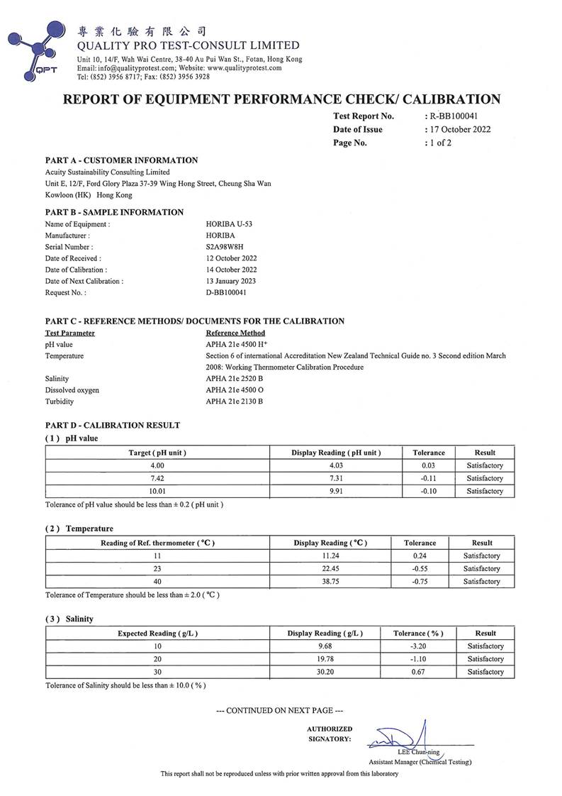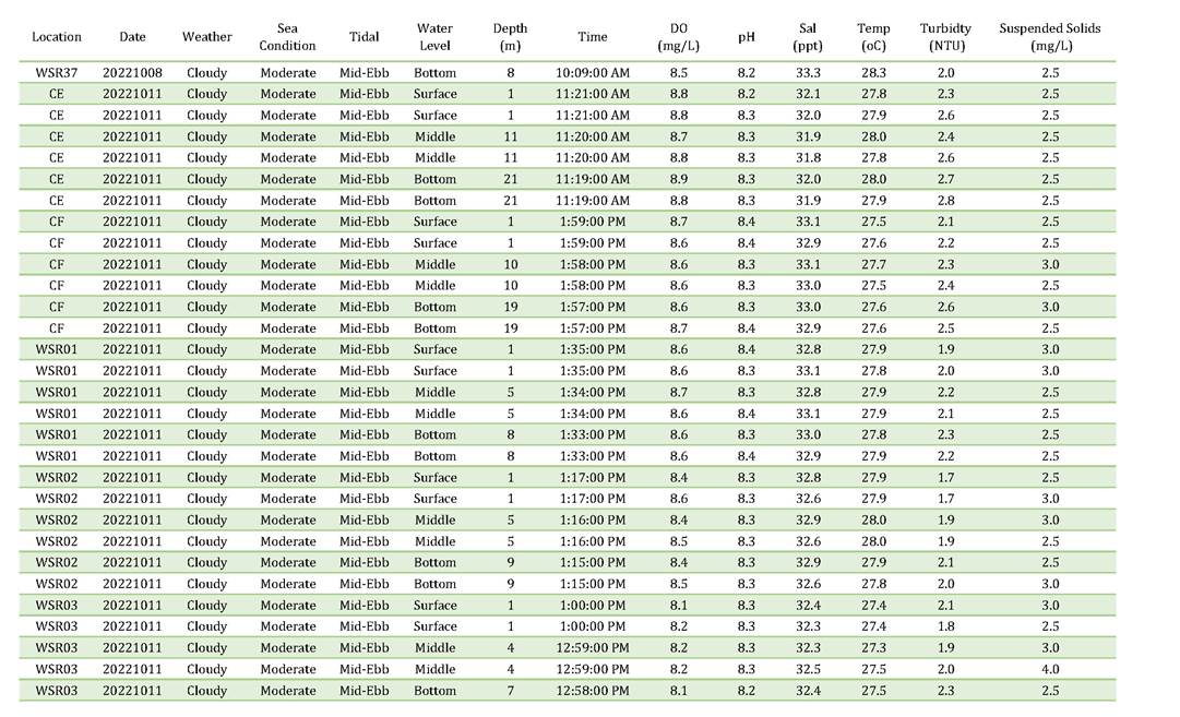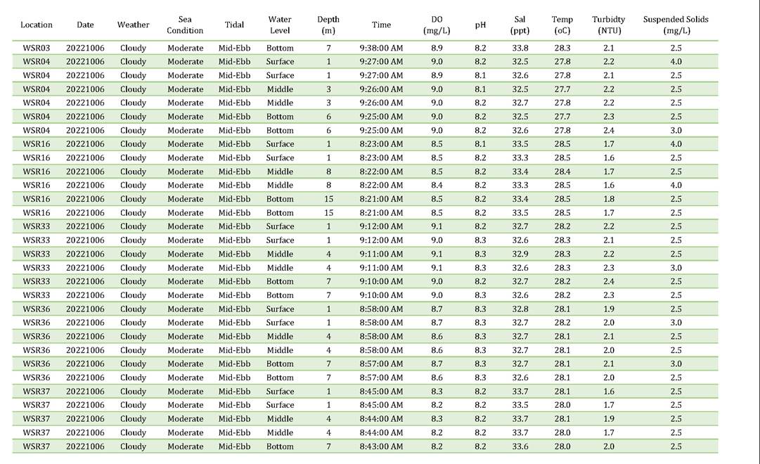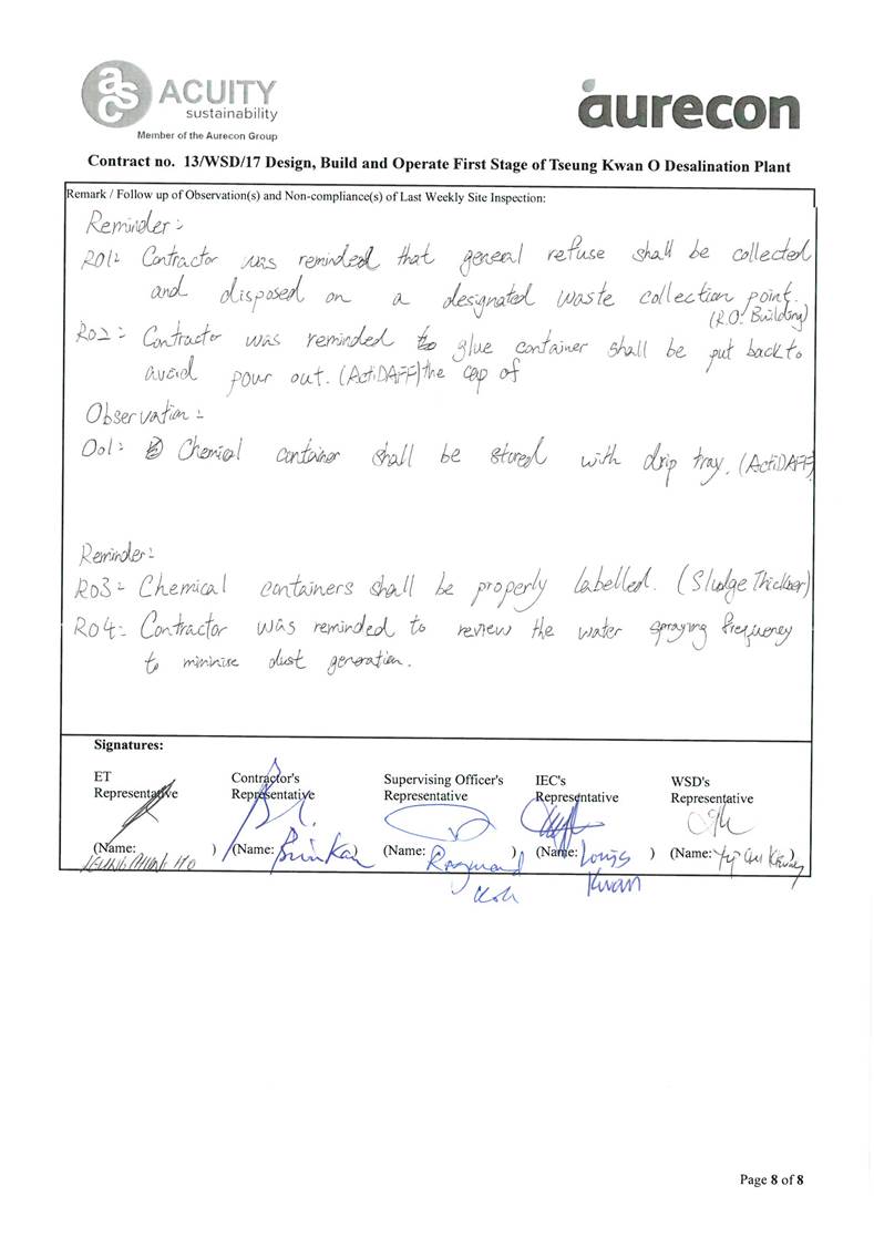 A2. In accordance with the Environmental Monitoring and Audit (EM&A) Manual for the Contract, EM&A works for marine water quality, noise, waste management and ecology should be carried out by Environmental Team (ET), Acuity Sustainability Consulting Limited (ASCL), during the construction phase of the Contract.