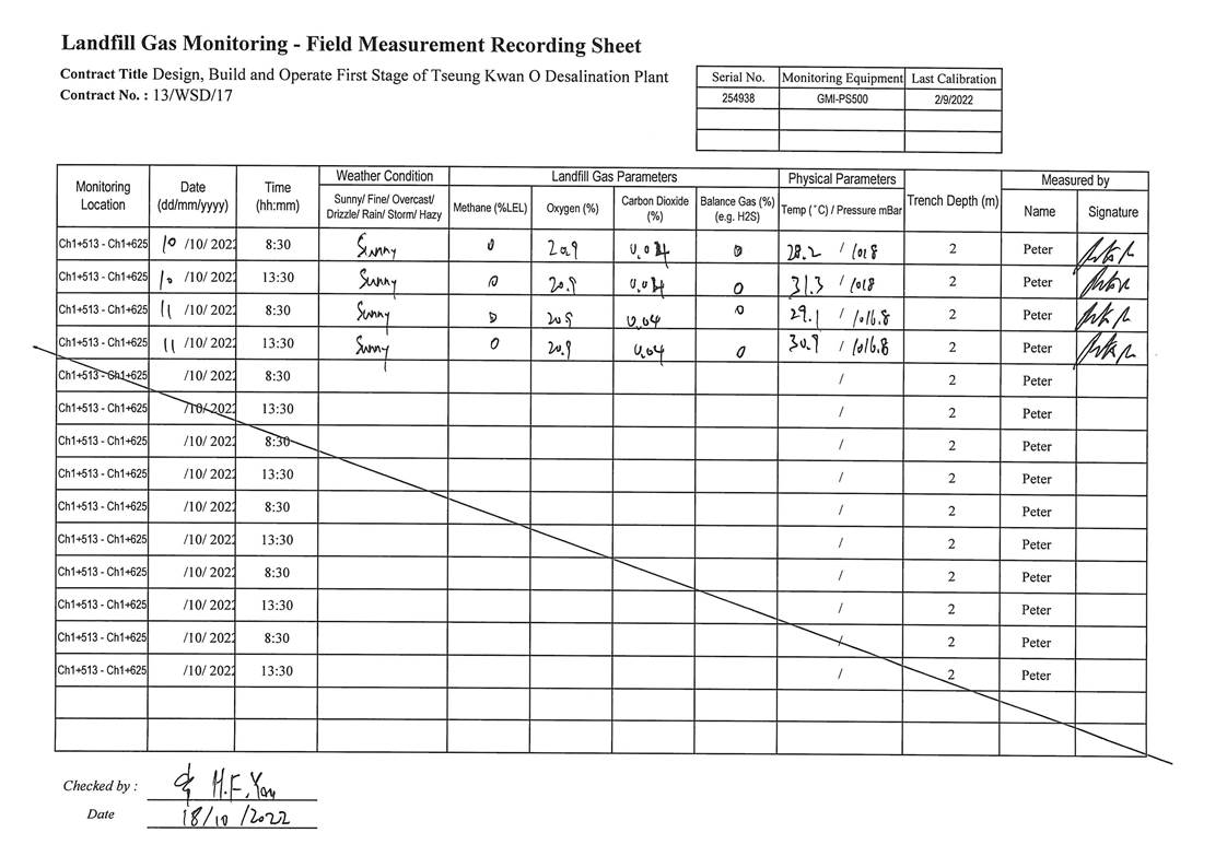 A12. In this reporting period, 16 times of landfill gas monitoring were conducted at Wan Po Road (Ch1+513 - Ch1+625). No action and limit level exceedance was recorded.