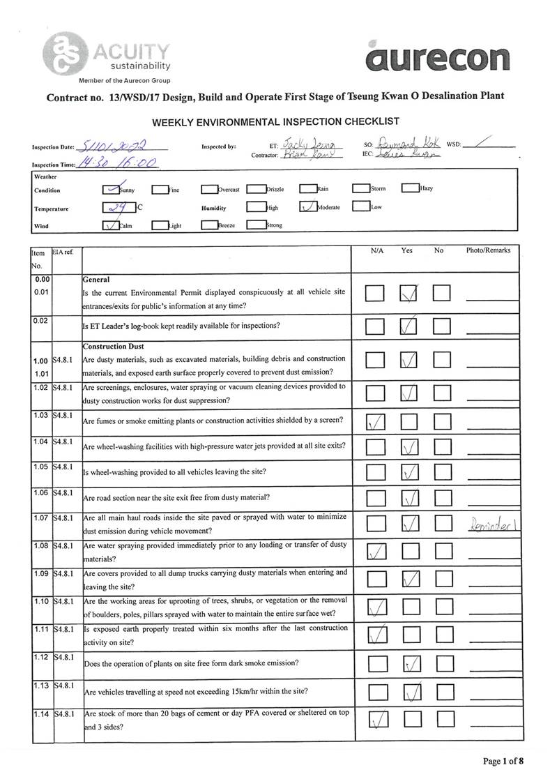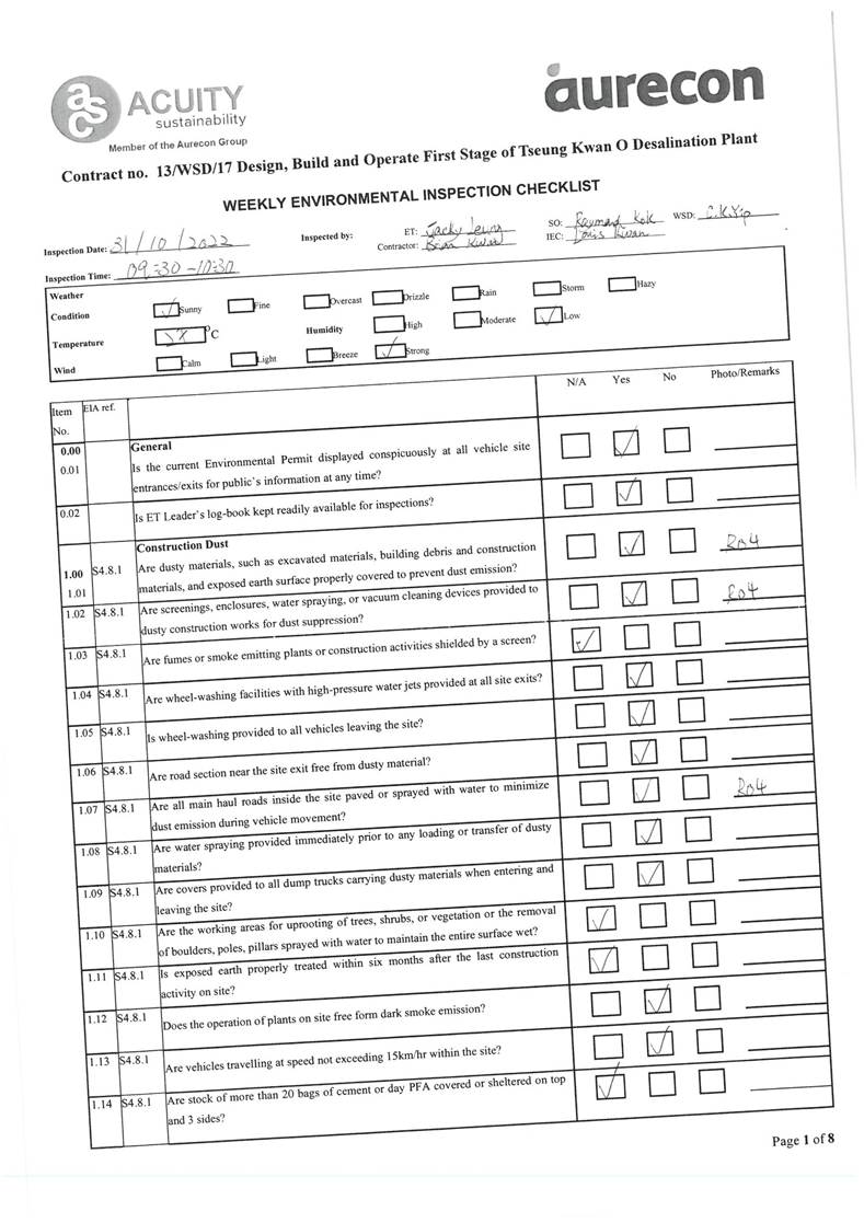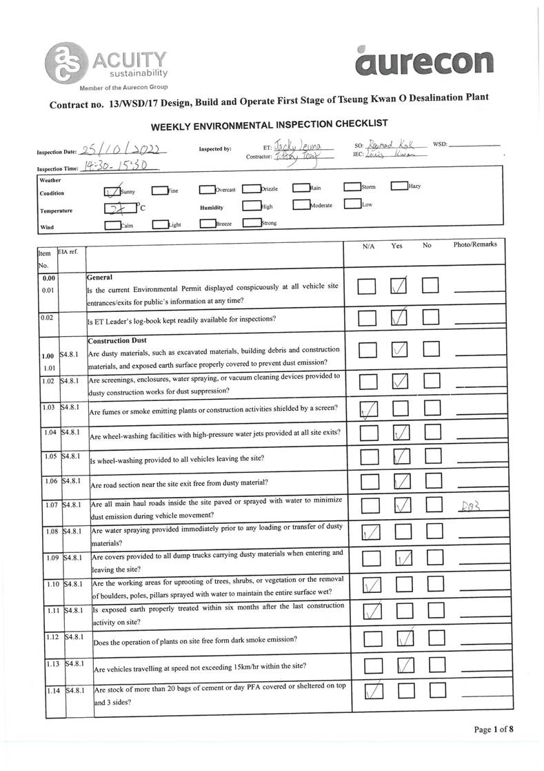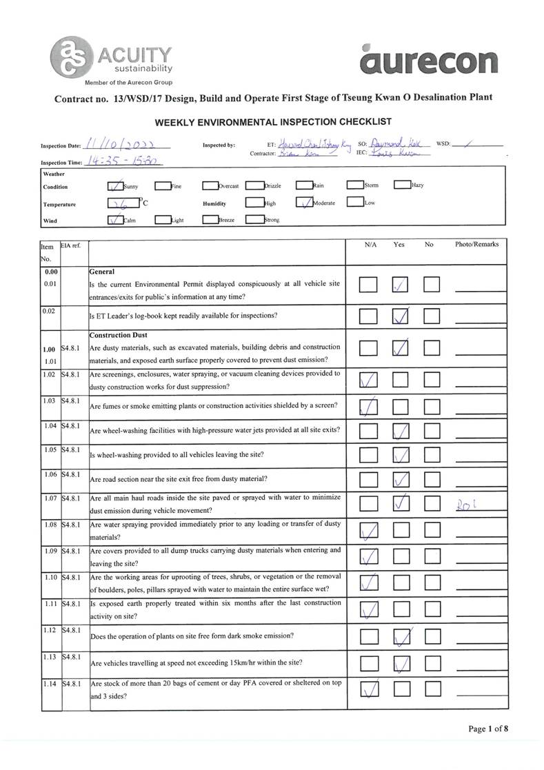 A13. Joint site inspections of the construction work by ET and IEC were carried out on 5, 11, 18, 25 and 31 October 2022 to audit the mitigation measures implementation status. Recommendations and observations were recorded in the site inspection checklists and provided to the contractors together with the appropriate follow-up actions where necessary.