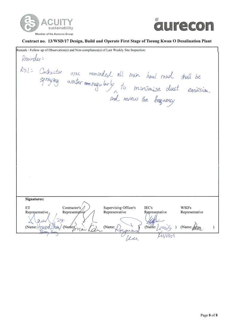 A8. No noise monitoring was conducted during the reporting period since there are no Contract -related construction activities undertaken within a radius of 300m from the monitoring locations. No exceedance of the Action Level was recorded during the reporting period.