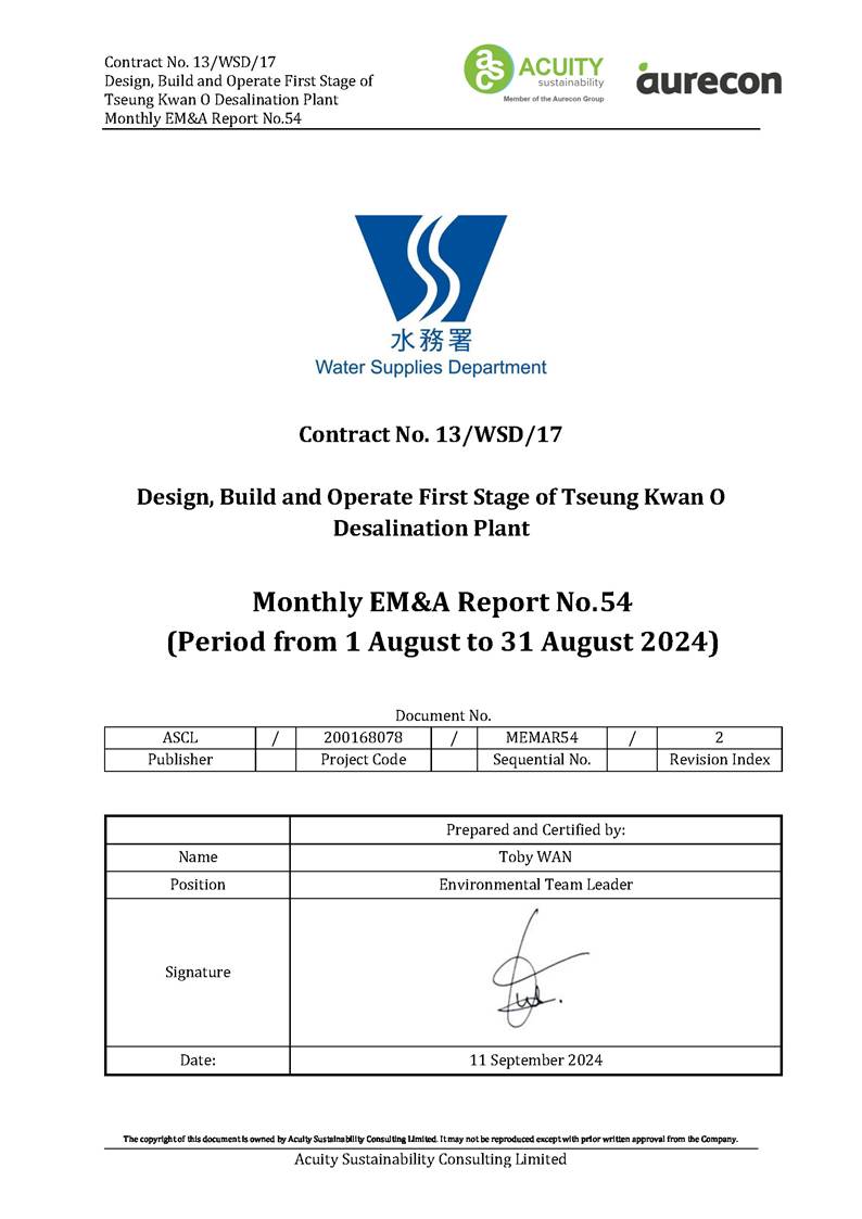 A3. This is the 54th Monthly EM&A Report, prepared by ASCL, for the Contract summarizing the monitoring results and audit findings of the EM&A programme at and around Tseung Kwan O Area 137 (TKO 137) during the reporting period from 1 August to 31 August 2024.