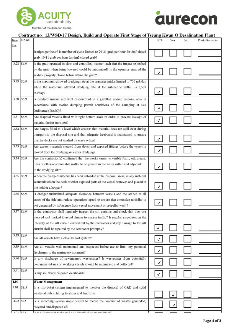 A2. In accordance with the Environmental Monitoring and Audit (EM&A) Manual for the Contract, EM&A works for marine water quality, noise, waste management and ecology should be carried out by Environmental Team (ET), Acuity Sustainability Consulting Limited (ASCL), during the construction phase of the Contract.