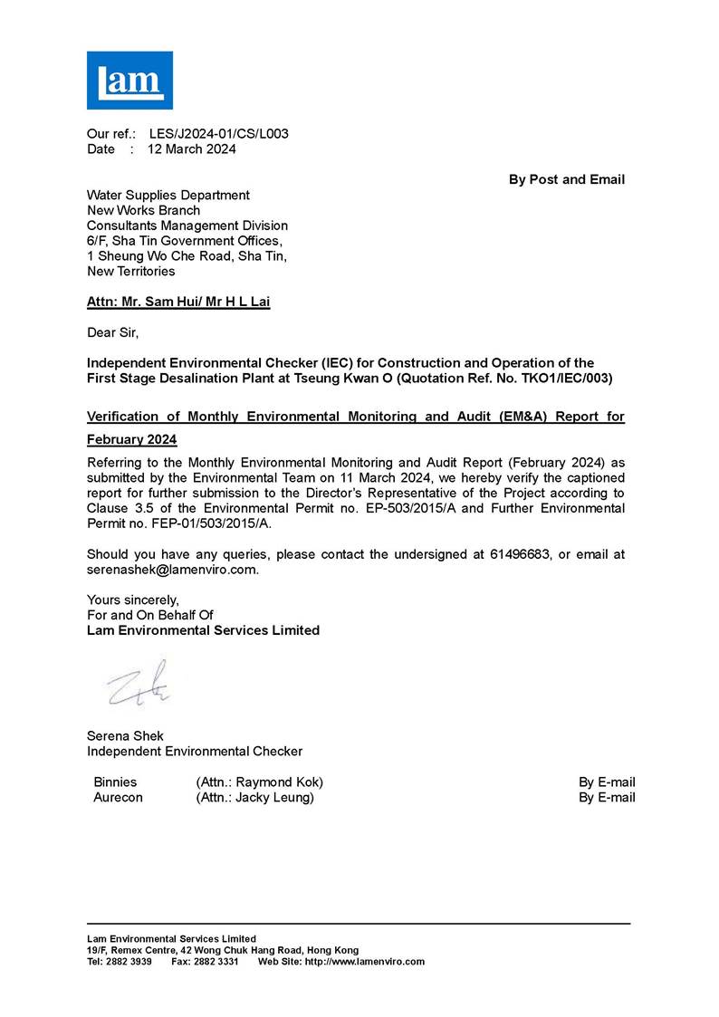 A3. This is the 48th Monthly EM&A Report, prepared by ASCL, for the Contract summarizing the monitoring results and audit findings of the EM&A programme at and around Tseung Kwan O Area 137 (TKO 137) during the reporting period from 1 February to 29 February 2024.