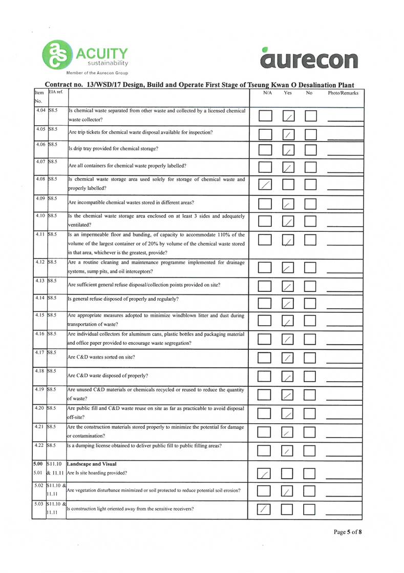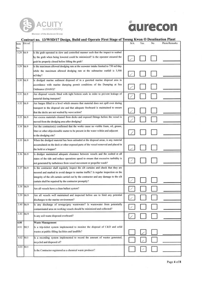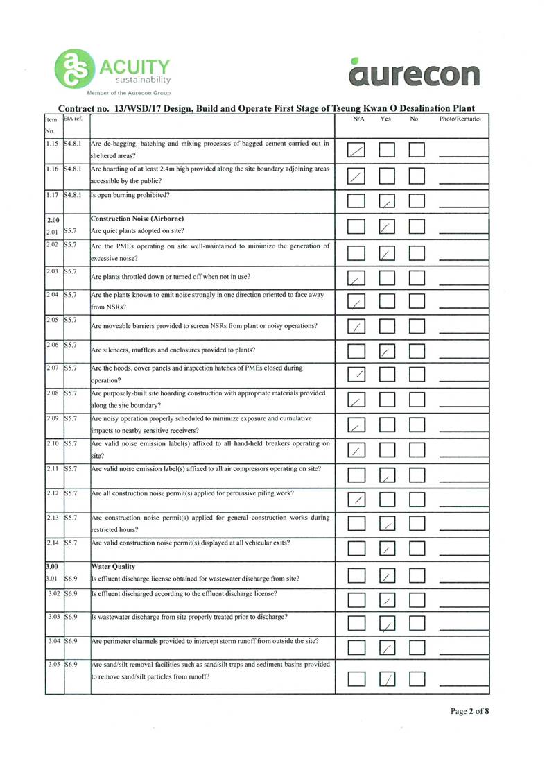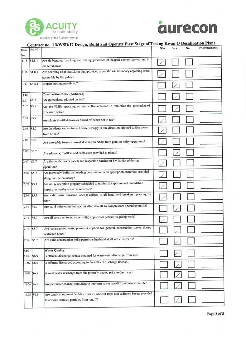 A2. In accordance with the Environmental Monitoring and Audit (EM&A) Manual for the Contract, EM&A works for marine water quality, noise, waste management and ecology should be carried out by Environmental Team (ET), Acuity Sustainability Consulting Limited (ASCL), during the construction phase of the Contract.