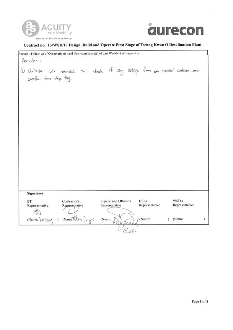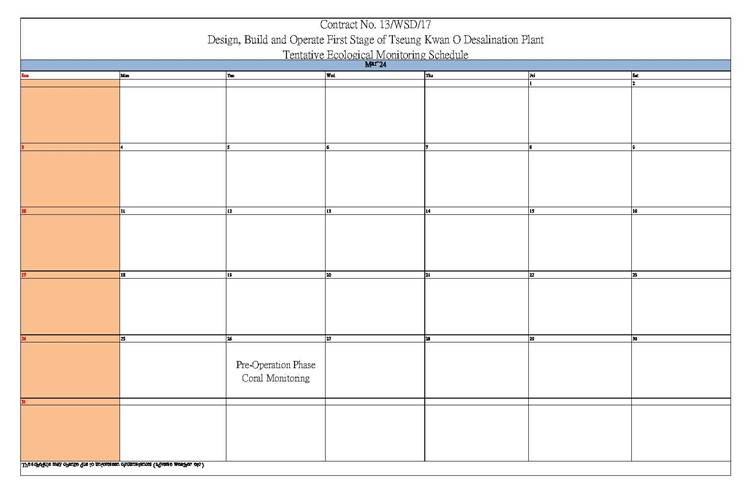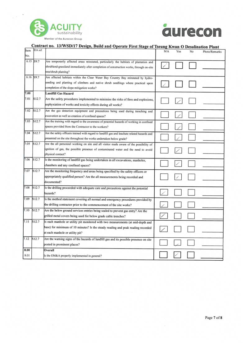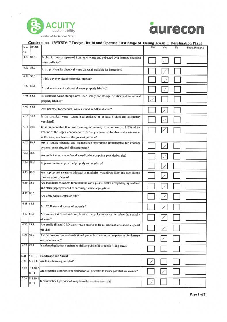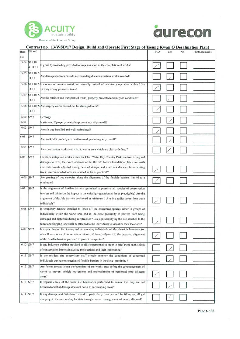 A2. In accordance with the Environmental Monitoring and Audit (EM&A) Manual for the Contract, EM&A works for marine water quality, noise, waste management and ecology should be carried out by Environmental Team (ET), Acuity Sustainability Consulting Limited (ASCL), during the construction phase of the Contract.