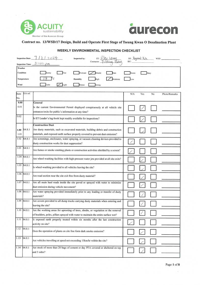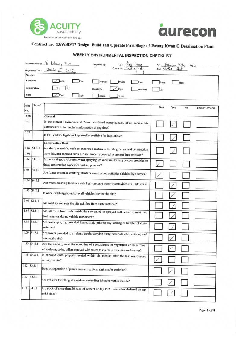 A15. Joint site inspections of the construction work by ET and IEC were carried out on 16 and 28 February 2024 to audit the mitigation measures implementation status. Reminders were recorded in the site inspection checklists and provided to the contractors together with the appropriate follow-up actions where necessary.