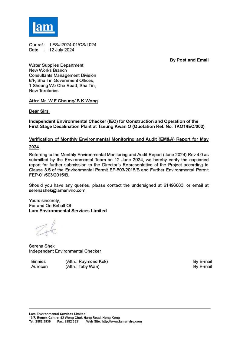 A3. This is the 52nd Monthly EM&A Report, prepared by ASCL, for the Contract summarizing the monitoring results and audit findings of the EM&A programme at and around Tseung Kwan O Area 137 (TKO 137) during the reporting period from 1 June to 30 June 2024.